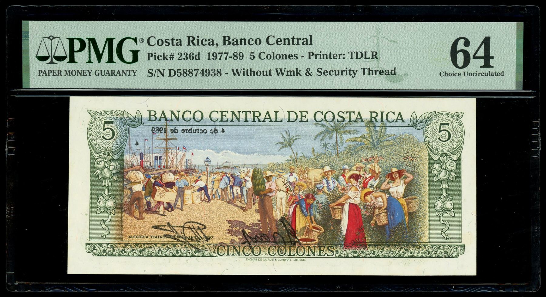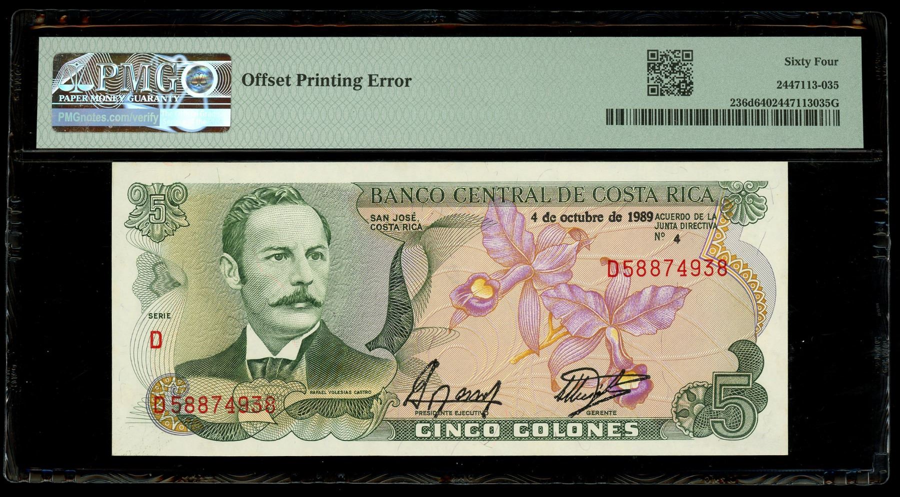 COSTA RICA, San José, Banco Central, 5 colones, 4-10-1989, series D, serial D58874938, offset printing error, PMG Choice UNC 64. Pick-236d. Consecutive to the prior lot notes, this Choice UNC piece shows off a bold overprint on its backside from an offset printing error.