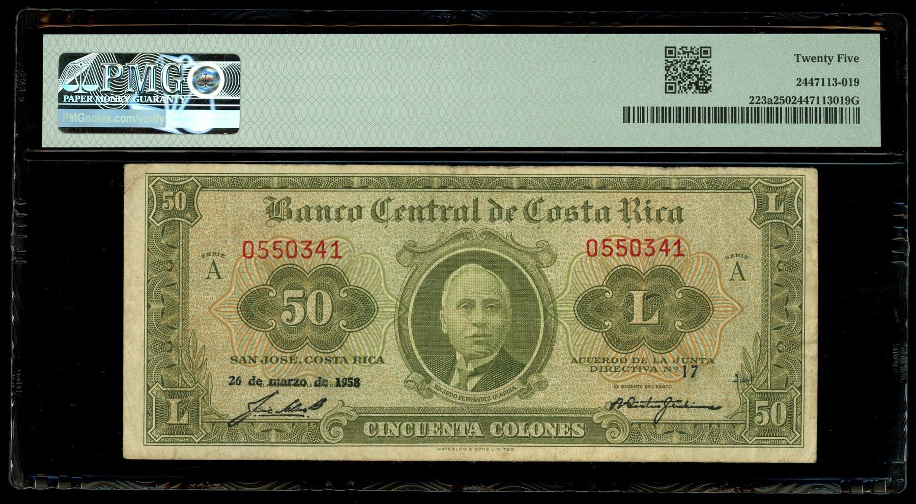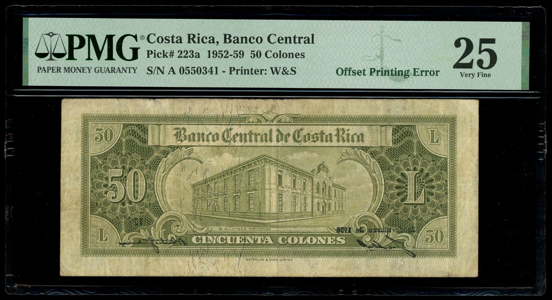 COSTA RICA, San José, Banco Central, 50 colones, 26-3-1958, series A, serial 0550341, offset printing error, PMG VF 25. Pick-223a. Bold overprint visible on the back of this circulated note due to an offset printing error.
