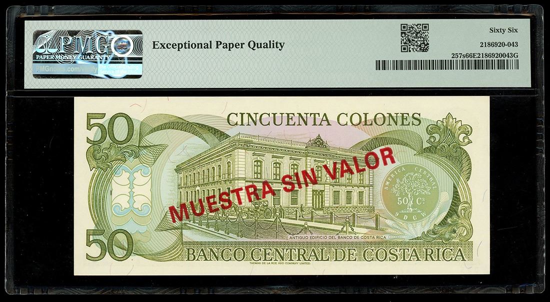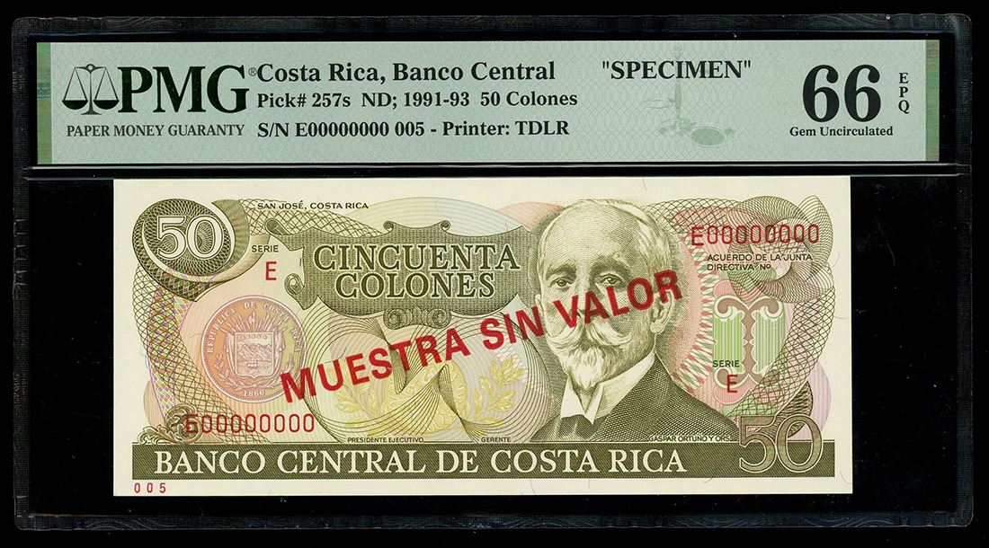 COSTA RICA, San José, Banco Central, 50 colones specimen, no date (1991-93), series E, PMG Gem UNC 66 EPQ. Pick-257s. Gem example of this colorful Costa Rican type, with well-centered printing exhibiting vivid ink colors and great paper originality.