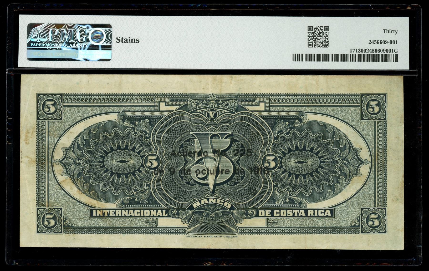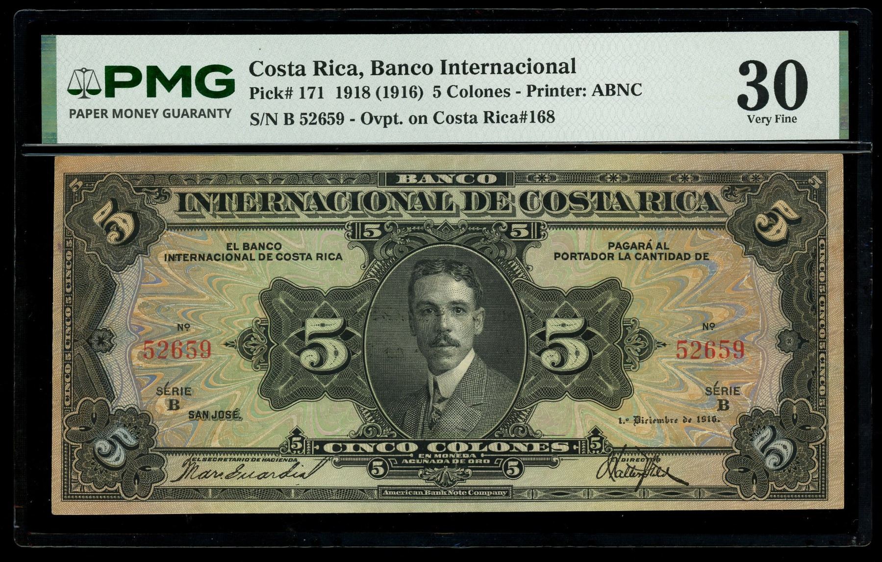 COSTA RICA, San José, Banco Internacional, 5 colones, 9-10-1918, series B, serial 52659, black overprint on 1-12-1916 5 colones, PMG VF 30, "top pop." Pick-171. Tied with one other for finest known in the PMG census. Quite colorful with nice margins around the design and a bold overprint on the back, some stain spots on the reverse, quite rare in any grade.