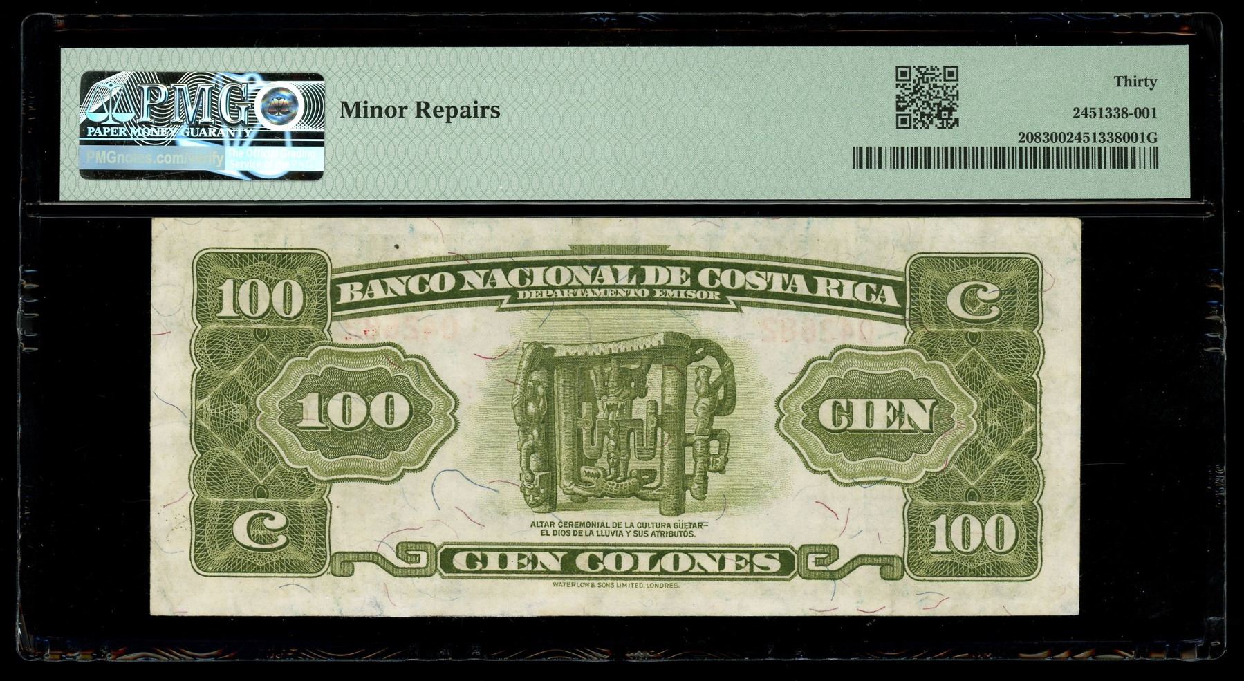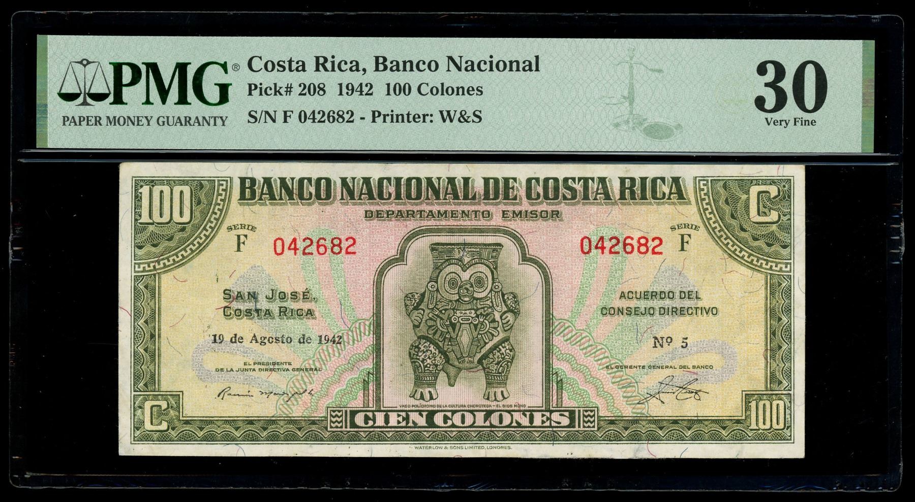 COSTA RICA, San José, Banco Nacional, 100 colones, 19-8-1942, series F, serial 042682, PMG VF 30. Pick-208. Wide circulation and low survival rates make this 100 colones a rather difficult high denomination note to find on the market today. Somewhat circulated with minor repairs done along the margins, the design itself still quite colorful and bold.