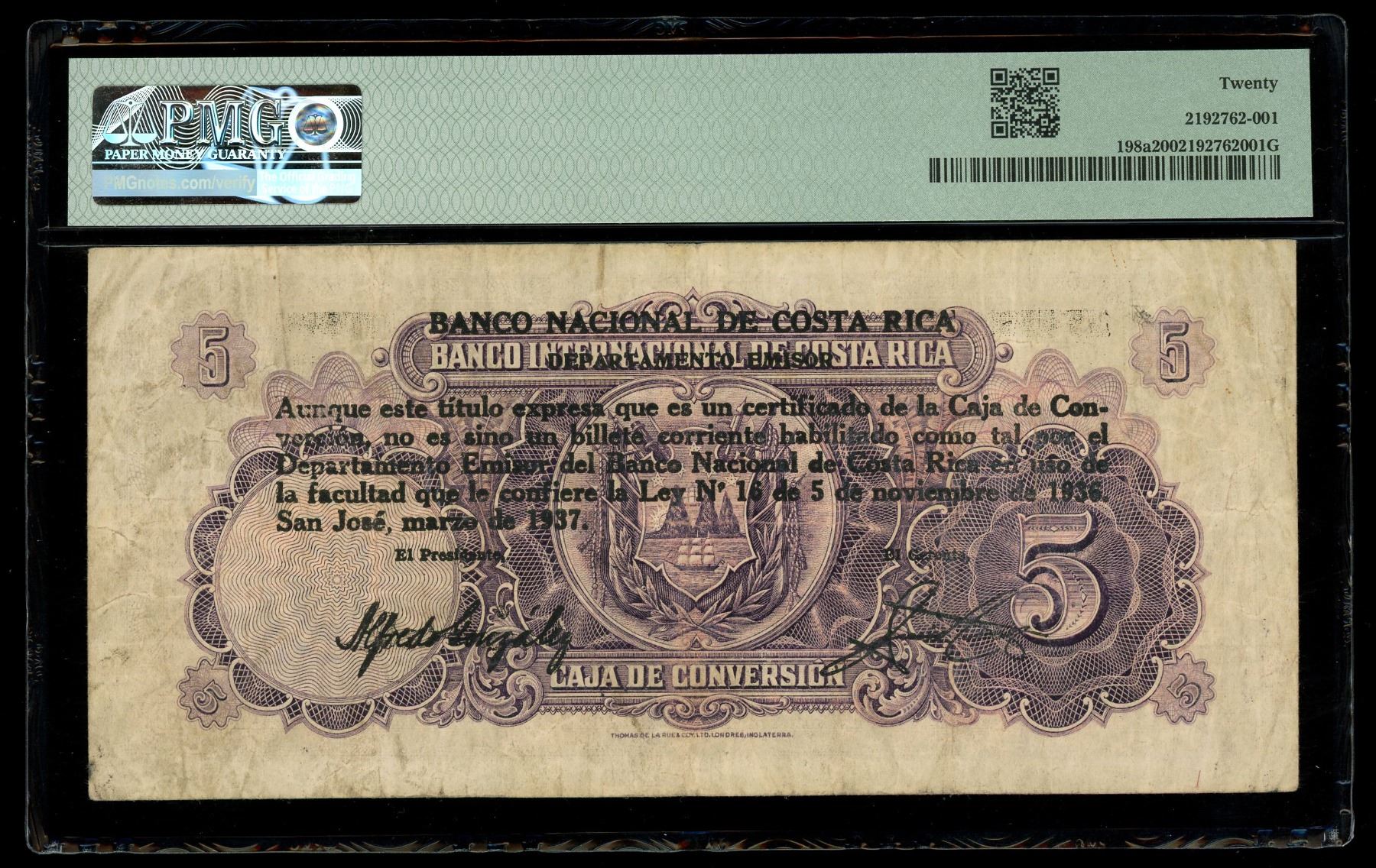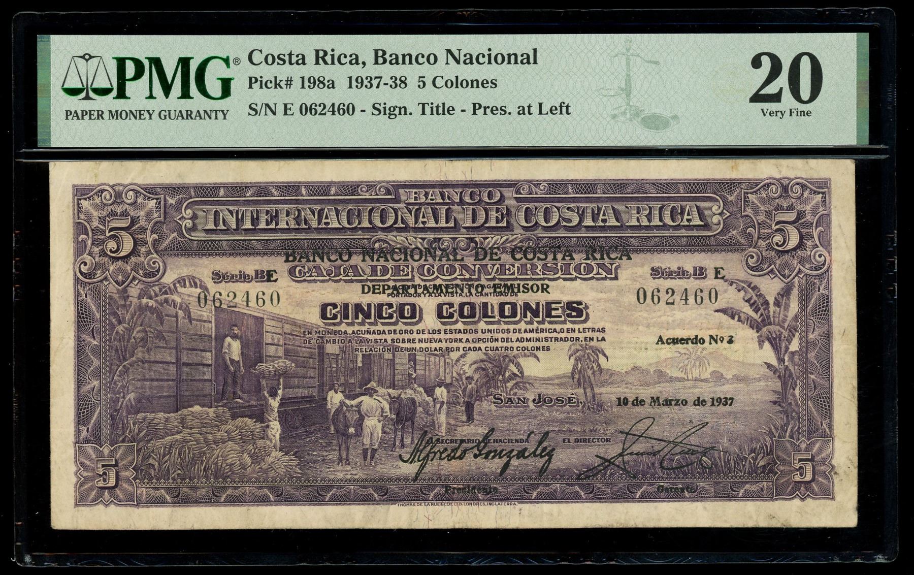 COSTA RICA, San José, Banco Nacional, 5 colones, 10-3-1937, series E, serial 062460, black overprint on Banco Internacional 5 colones, PMG VF 20. Pick-198a. Bold overprint seen on this note issued by the Banco Nacional using unused Banco Internacional notes, this one notable for its large train-loading vignette on the face. Bold purple ink design, some embossing seen across the back, a couple of pinholes noted along the right side.
