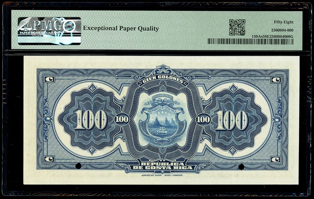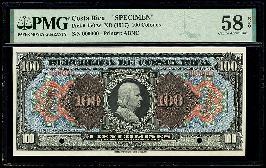 COSTA RICA, San José, República de Costa Rica, specimen 100 colones, (1917), PMG Choice AU 58 EPQ. Pick-150As. Two POCs. The front vignette depicts the right-facing bust of Christopher Columbus against a vivid blue, red, and green underprint, while the reverse features the coat of arms of Costa Rica. We previously offered the only known remainder of this type in May of 2021, so it's fitting that we finally handle a specimen example of this rare, nicely designed type. Boldly printed with great paper originality with perhaps some trivial handling to mark the grade.