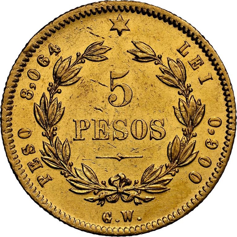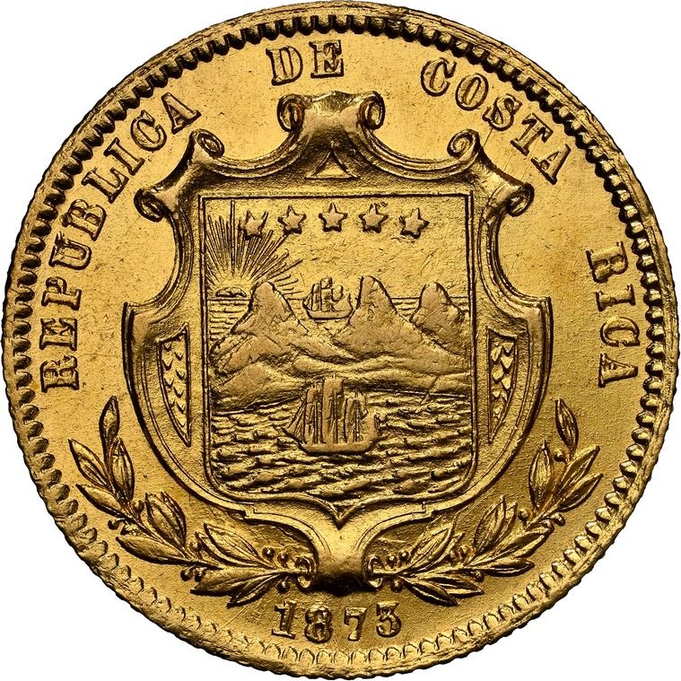 COSTA RICA, San José, gold 5 pesos, 1873 GW,  5 pesos  variety, NGC AU 58.