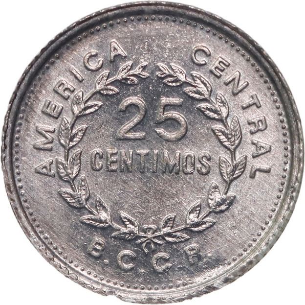 COSTA RICA, aluminum piefort reverse trial strike 25 céntimos, (1983-89), NGC MS 65. KM-188.3. Bright and 100% free of wear and marks, the surface just a bit grainy (as made), the blank side curiously sunken in as struck with a blank die (as opposed to not being struck at all).