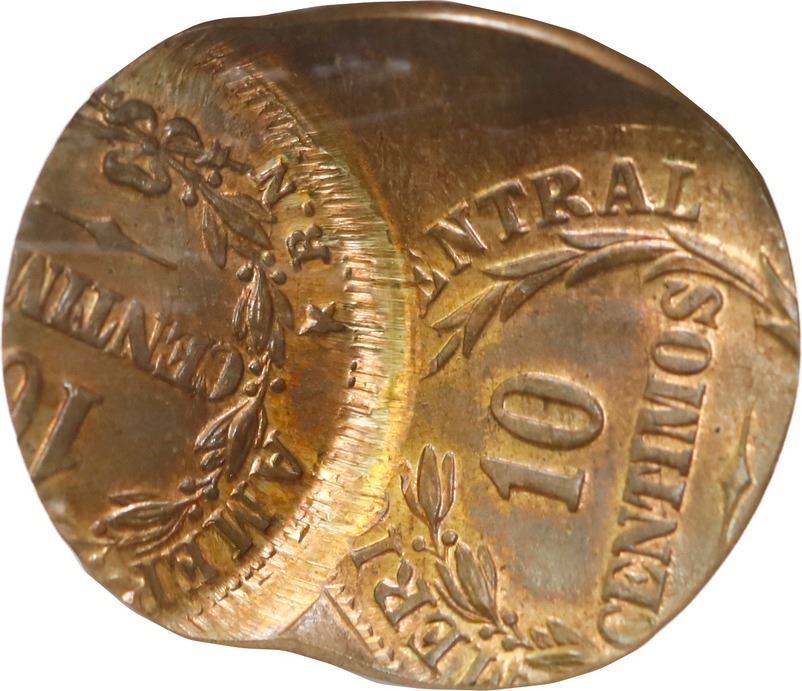 COSTA RICA, brass 10 céntimos, 1947, off-center and double-struck, NGC MS 65 / mint error.