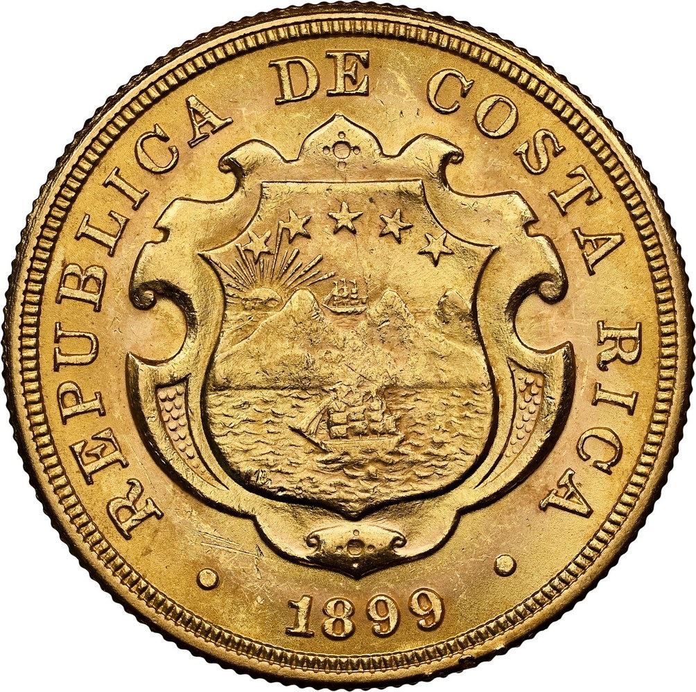 COSTA RICA, struck at the Philadelphia mint, gold 20 colones, 1899, NGC MS 62.