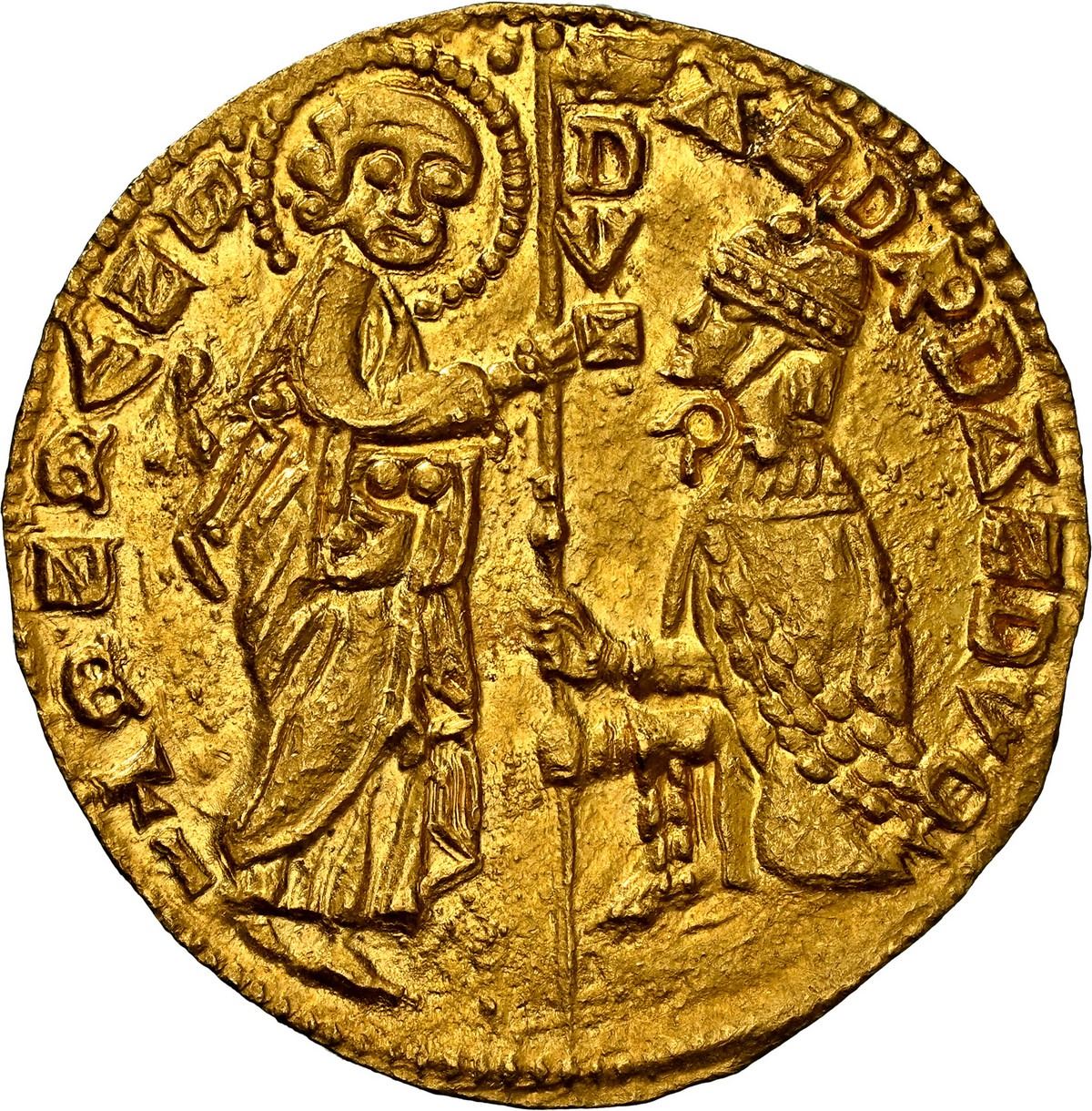 CRUSADER STATES, Maona of Chios, gold ducat (imitation Venetian zecchino), in name of Andrea Dandolo (1343-54), no date (ca. 1347-1566), NGC MS 65. Fr-2A (imitation of Fr-1221, Montenegro-93). Doge Andrea Dandolo kneeling before St. Mark, standing right, holding book of Gospels in his left hand and presenting banner inscribed DVX / Christ, nimbate, standing facing in mandorla with nine stars, raising his right hand in benediction and holding book of Gospels in his left. High-grade imitation of a Venetian zecchino, with beautiful luster and crisp, clear details.