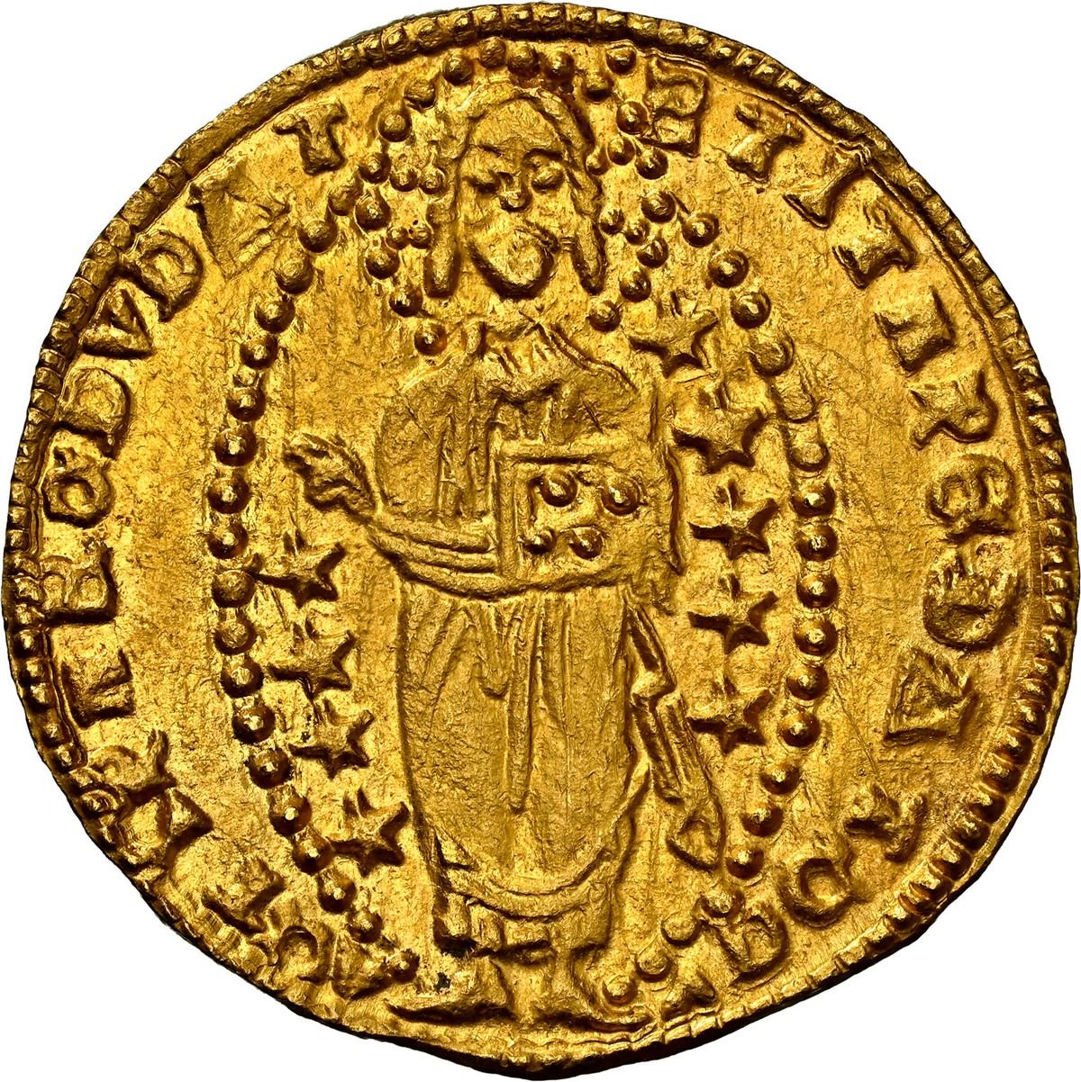 CRUSADER STATES, Maona of Chios, gold ducat (imitation Venetian zecchino), in name of Andrea Dandolo (1343-54), no date (ca. 1347-1566), NGC MS 65. Fr-2A (imitation of Fr-1221, Montenegro-93). Doge Andrea Dandolo kneeling before St. Mark, standing right, holding book of Gospels in his left hand and presenting banner inscribed DVX / Christ, nimbate, standing facing in mandorla with nine stars, raising his right hand in benediction and holding book of Gospels in his left. High-grade imitation of a Venetian zecchino, with beautiful luster and crisp, clear details.