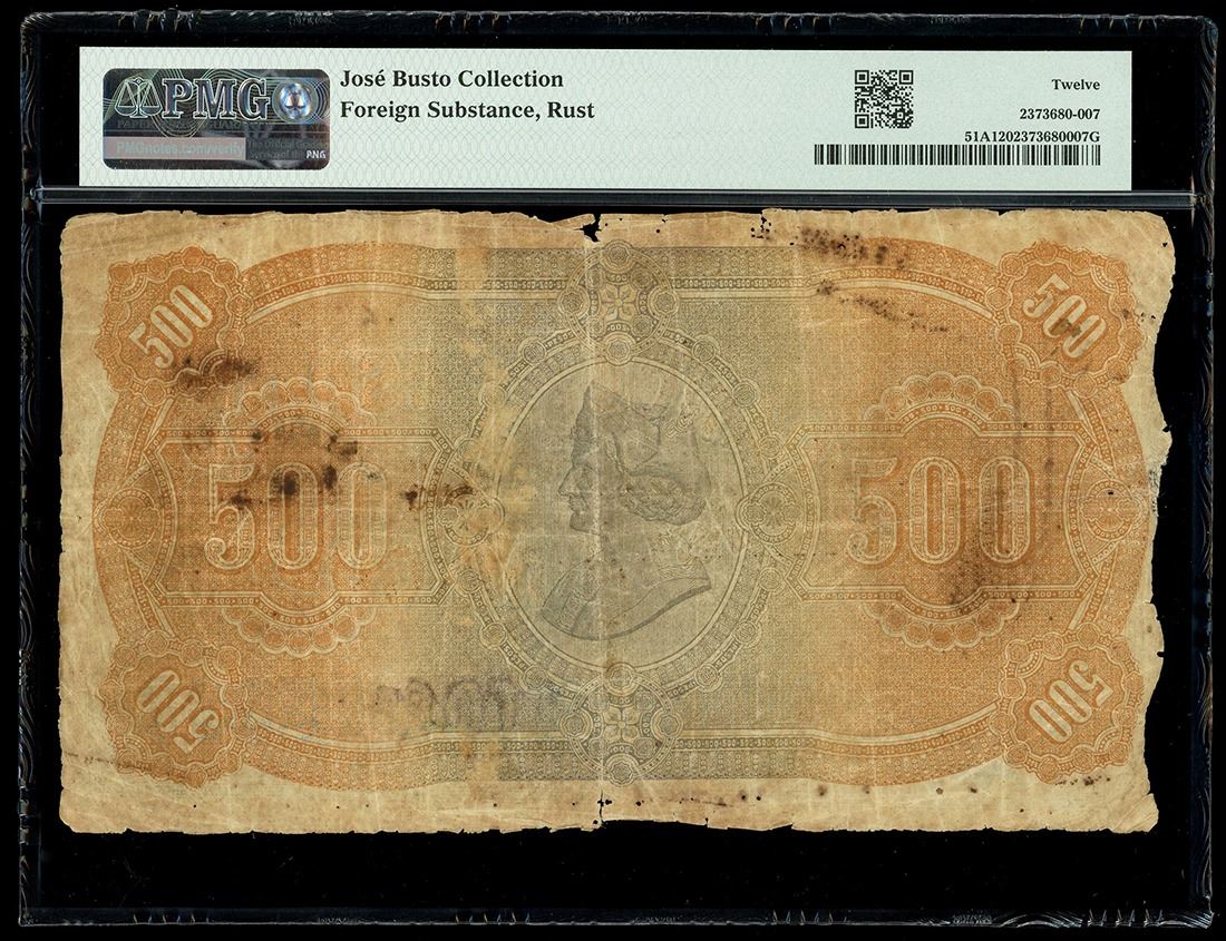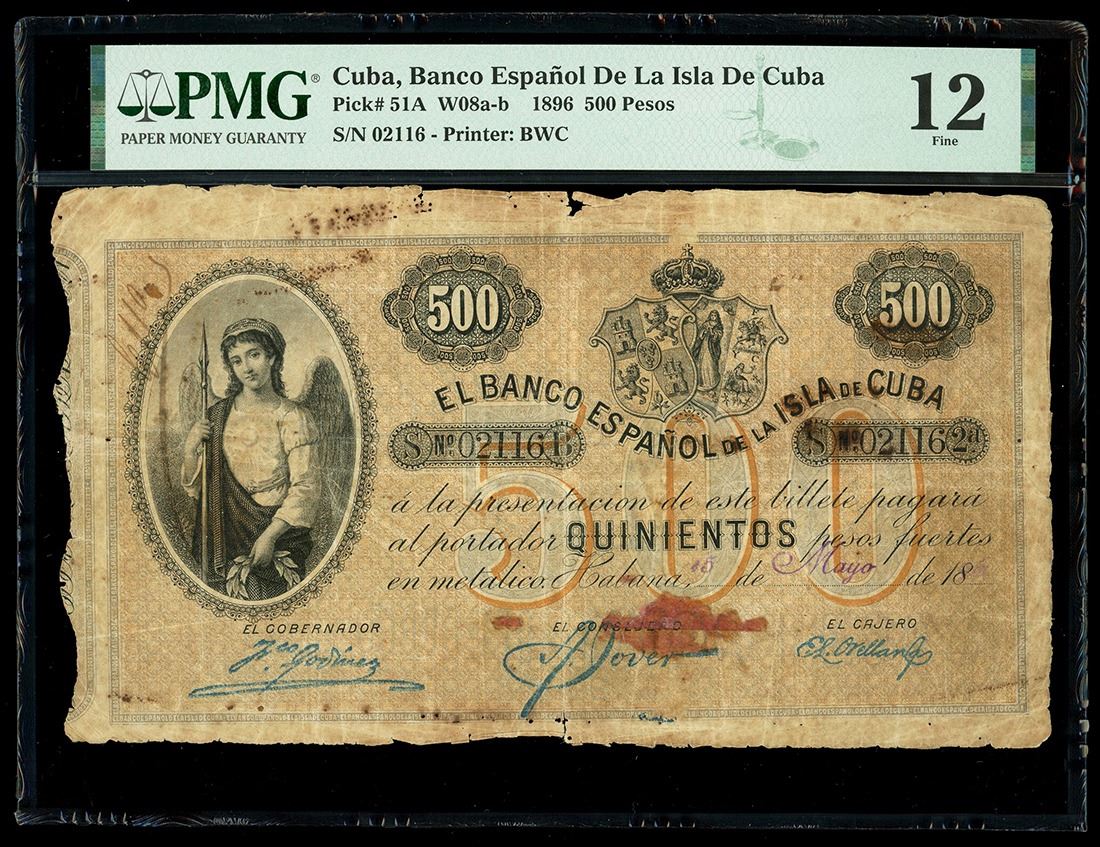 CUBA, Banco Español de la Isla de Cuba, 500 pesos, 15-5-1896, serial 02116, very rare, PMG F 12, ex-Busto. Pick-51A. Very rare, high-denomination Cuban note that is not priced in any grade in Pick. A large angel vignette features prominently at left. Though well circulated with some foreign substance and rust stains plus small edge-splits in margins, the design remains quite bold with clear stamped signatures and most of the date (only the year is weak). A rare opportunity for the specialist Cuban note collector. Pedigreed to the José Busto Collection (stated on label).