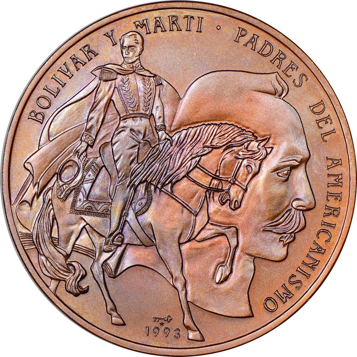 CUBA, Havana mint, copper off-metal 1 peso, 1993, Bolívar and Marti, arms with plain field, NGC MS 6