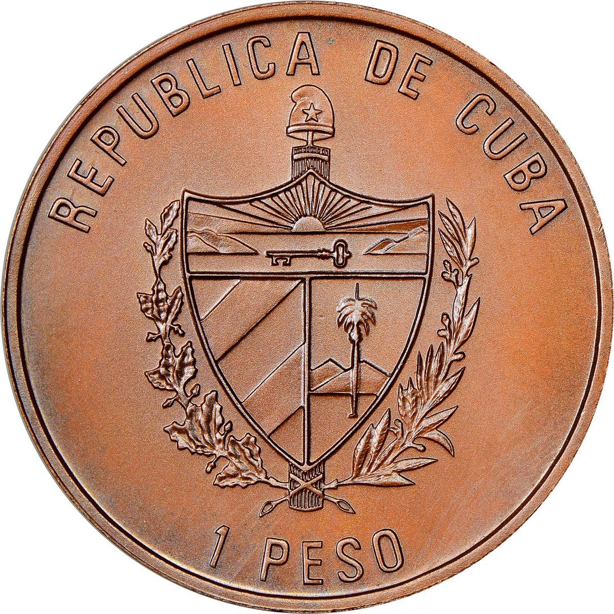 CUBA, Havana mint, copper off-metal 1 peso, 1993, Bolívar and Marti, arms with plain field, NGC MS 67 BN, "top pop," ex-Busto. Well-struck example of this popular Cuban commemorative coin design struck in copper with deep purple and red toning hues, tied with just two others for finest known in the NGC census. Pedigreed to the José Busto Collection.