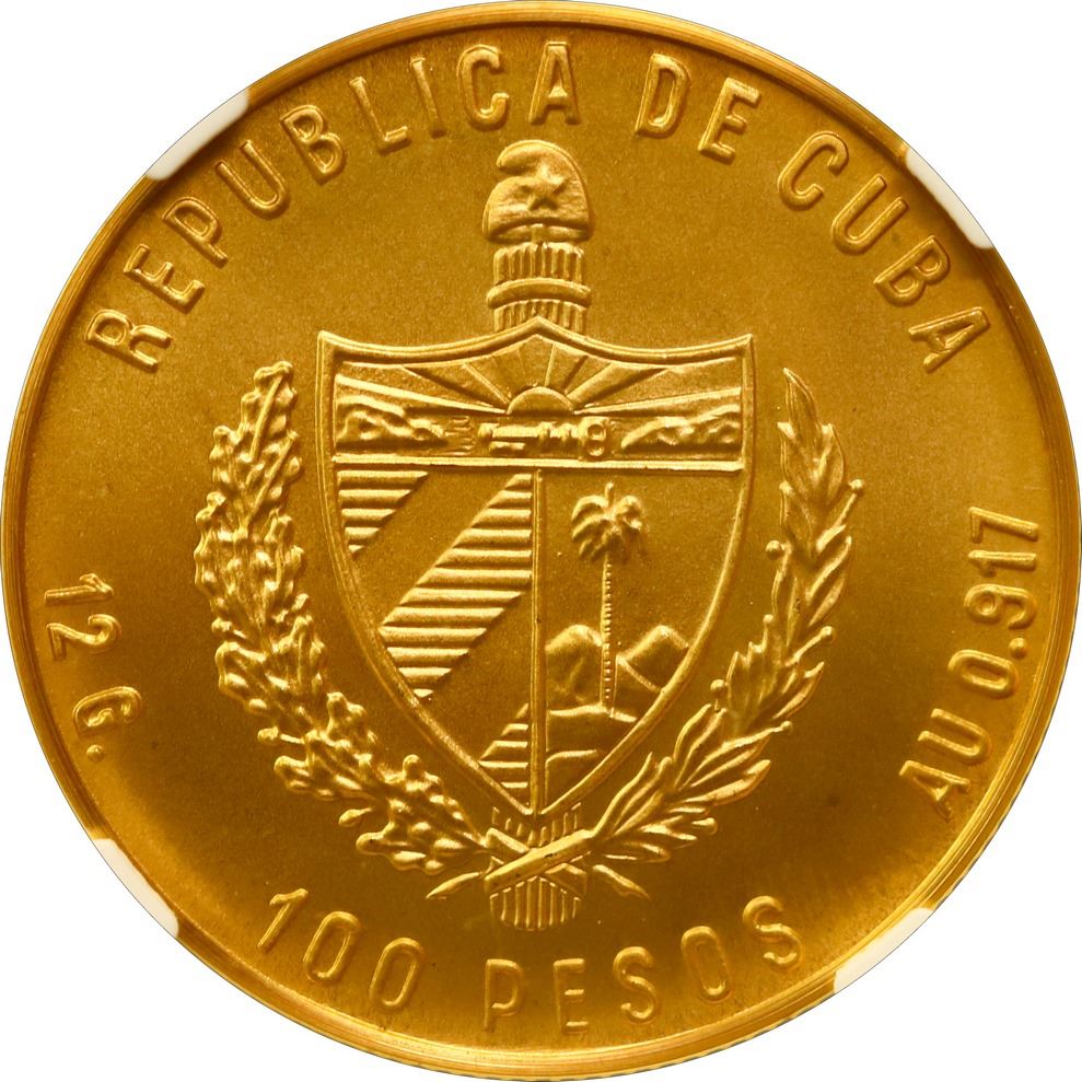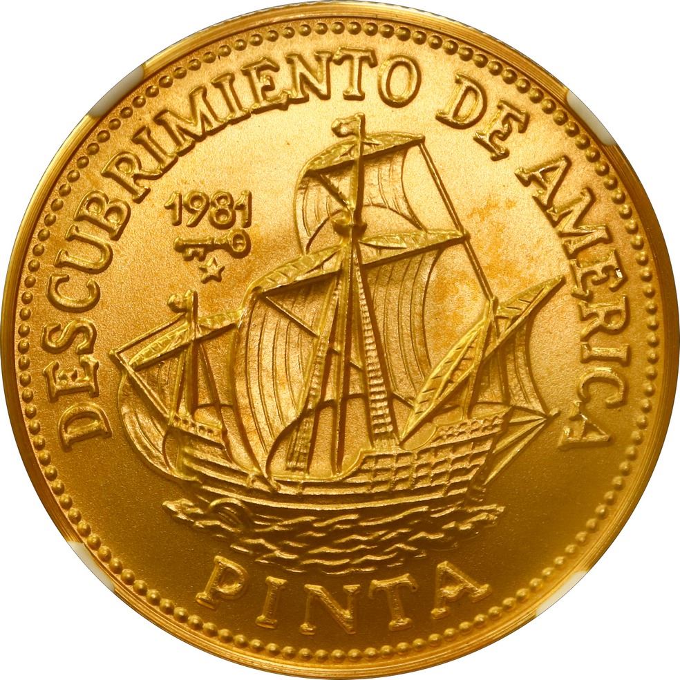 CUBA, Havana mint, gold 100 pesos, 1981, Columbus' ship Pinta, NGC MS 67 (EMO Collection Label).