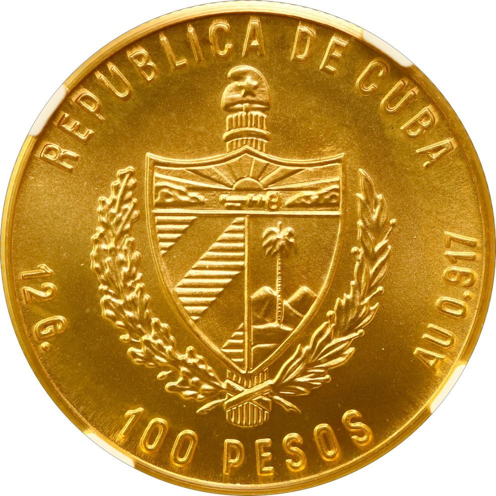 CUBA, Havana mint, gold 100 pesos, 1981, Columbus' ship Santa María, NGC MS 68 (EMO Collection Label). KM-87; Fr-13. Satin frosted-finish surface with just a few small spots, from a reported mintage of 2000 coins. Pedigreed to The Emilio M. Ortiz Collection of Cuban Gold Coins.