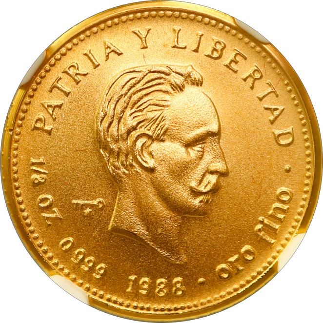 CUBA, Havana mint, gold 15 pesos, 1988, José Martí, NGC MS 69 (EMO Collection Label), "top pop." KM-212; Fr-23. Frosted finish with matte luster, nearly perfect, from a reported mintage of just 50 coins, this example currently tied with four others for finest in the NGC census. Pedigreed to The Emilio M. Ortiz Collection of Cuban Gold Coins.