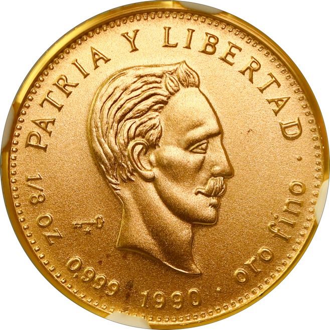 CUBA, Havana mint, gold 15 pesos, 1990, José Martí, NGC MS 69 Ultra Cameo (EMO Collection Label). KM-212; Fr-23. Perfect frosted finish except for several very faint red spots, from a reported mintage of just 15 pieces. (Note: Coin is rotated in the slab.). Pedigreed to The Emilio M. Ortiz Collection of Cuban Gold Coins.