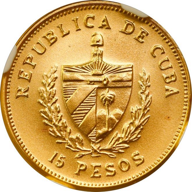CUBA, Havana mint, gold piefort 15 pesos, 1990, José Martí, NGC MS 69 (EMO Collection Label).