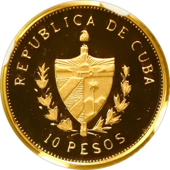 CUBA, Havana mint, gold proof 10 pesos, 1989, José Martí, NGC PF 69 Ultra Cameo (EMO Collection Label), "top pop." KM-211; Fr-24. Superb mirror cameo with the faintest rub on Martí's brow, tied with two others for finest in the NGC census, from a reported mintage of just 15 pieces. Pedigreed to The Emilio M. Ortiz Collection of Cuban Gold Coins.