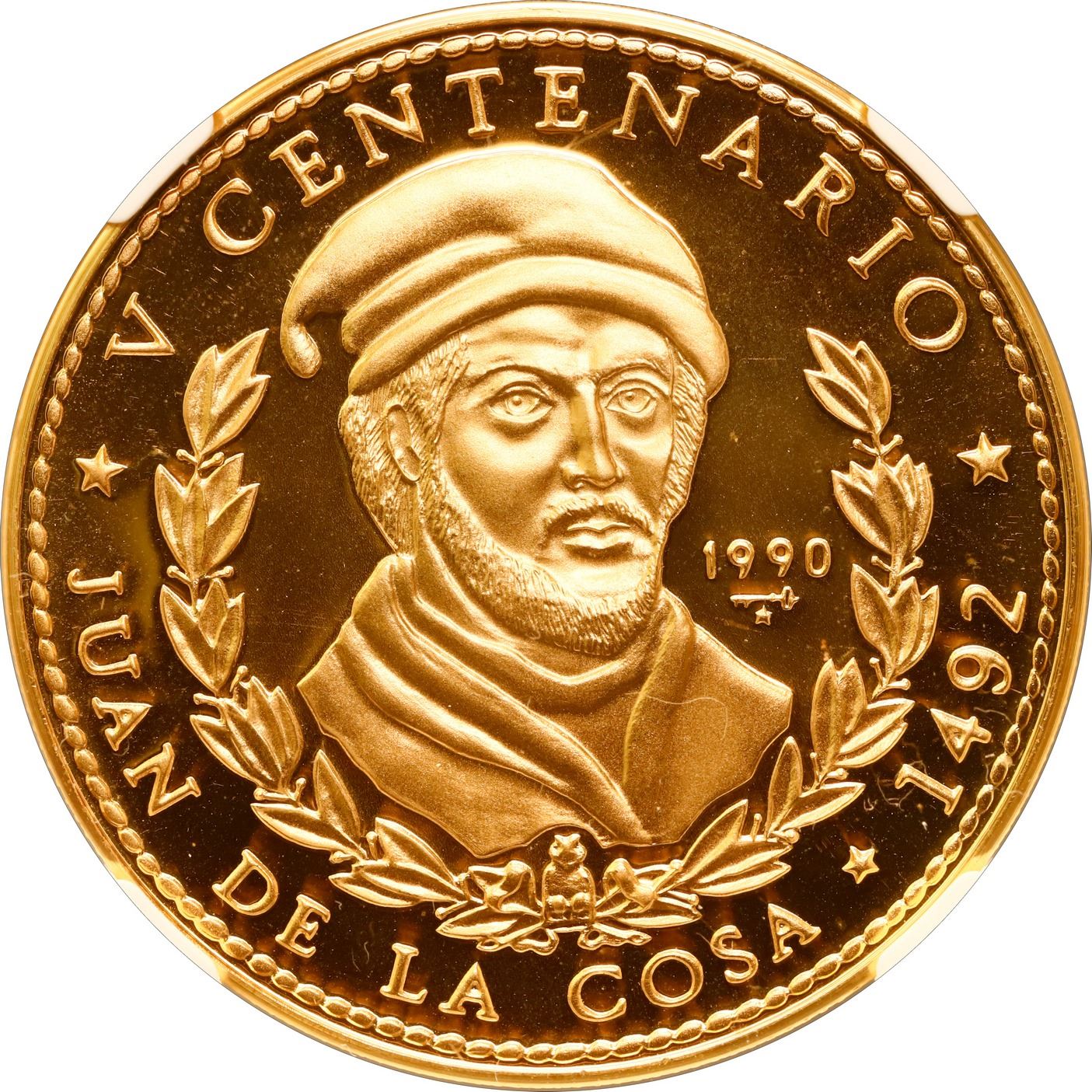 CUBA, Havana mint, gold proof 100 pesos, 1990, Juan de la Cosa New World 500th Anniversary, NGC PF 69 Ultra Cameo, "top pop." KM-305; Fr-51. Bright and flashy mirror fields with strong cameo effect, virtually flawless, from a reported mintage of 250 pieces.