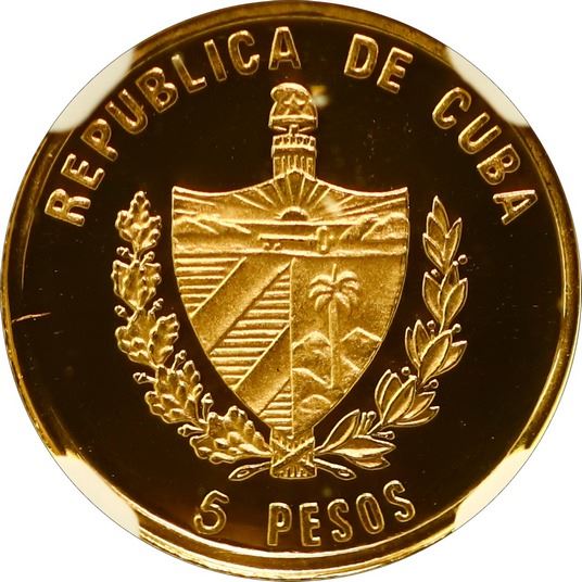 CUBA, Havana mint, gold proof 5 pesos, 2005, Alexandria Lighthouse, striped arms, NGC PF 69 Ultra Cameo (EMO Collection Label), "top pop." KM-739. Light yellow color, virtually flawless, with interesting reverse-frosted legend, currently tied with one other for finest in the NGC census, from a reported mintage of 5000 pieces. Pedigreed to The Emilio M. Ortiz Collection of Cuban Gold Coins.