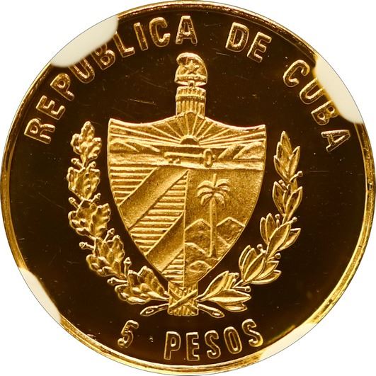 CUBA, Havana mint, gold proof 5 pesos, 2005, Cortés, Montezuma, and Aztec Pyramid, striped arms, NGC PF 68 Ultra Cameo (EMO Collection Label). KM-746. Bright mirror fields, visually near-perfect, from a reported mintage of 15,000 pieces. Pedigreed to The Emilio M. Ortiz Collection of Cuban Gold Coins.