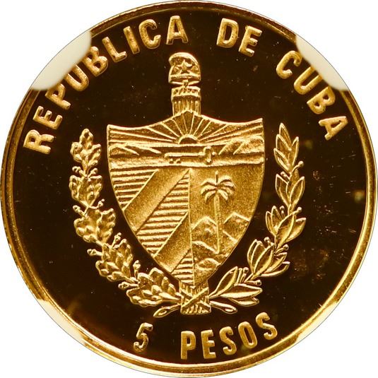 CUBA, Havana mint, gold proof 5 pesos, 2005, Halicarnassus Mausoleum, striped arms, NGC PF 69 Ultra Cameo (EMO Collection Label), finest known in NGC census. KM-745. Superb mirror fields with no visible flaws, currently the finest of just five in the NGC census, from a reported mintage of 5000 pieces. Pedigreed to The Emilio M. Ortiz Collection of Cuban Gold Coins.