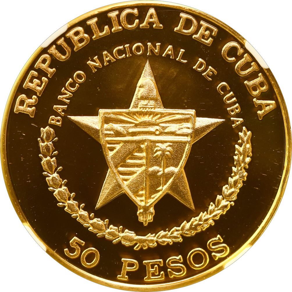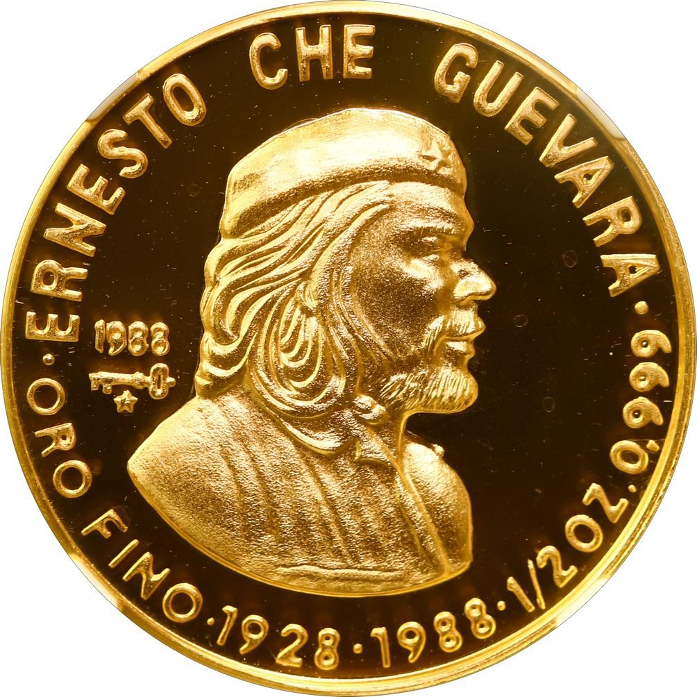 CUBA, Havana mint, gold proof 50 pesos, 1988, Birth of Che Guevara 60th Anniversary, NGC PF 68 Ultra Cameo (EMO Collection Label). KM-209; Fr-18. Nearly perfect with full cameo mirroring, from a reported mintage of 150 pieces only. Pedigreed to The Emilio M. Ortiz Collection of Cuban Gold Coins.