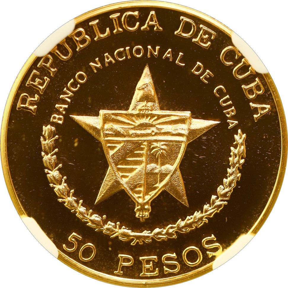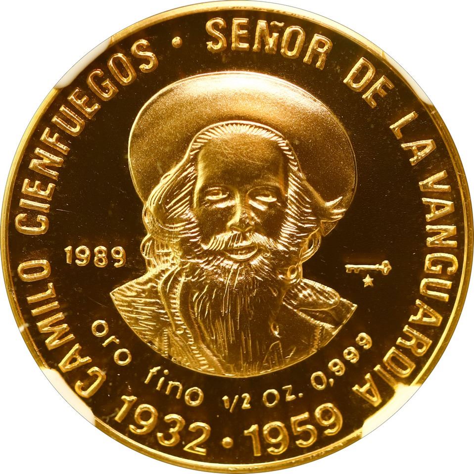 CUBA, Havana mint, gold proof 50 pesos, 1989, Camilo Cienfuegos Death 30th Anniversary, NGC PF 68 Ultra Cameo (EMO Collection Label). KM-331; Fr-36. Flashy but with less cameo effect from faintly spotty fields, from a reported mintage of 150 pieces. Pedigreed to The Emilio M. Ortiz Collection of Cuban Gold Coins.