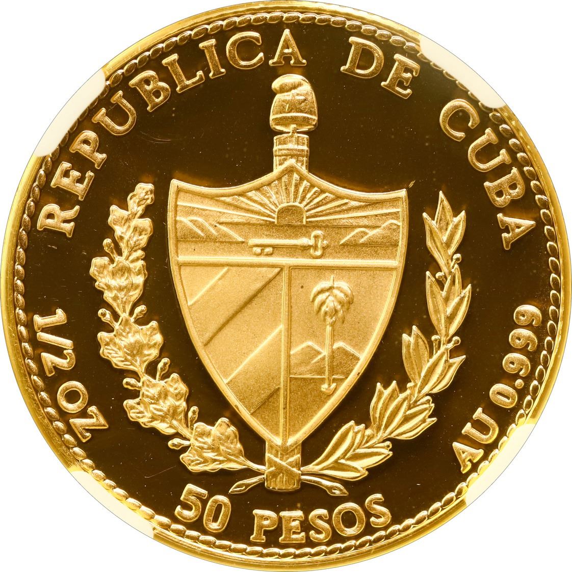 CUBA, Havana mint, gold proof 50 pesos, 1990, Queen Isabela New World 500th Anniversary, plain arms, NGC PF 69 Ultra Cameo (EMO Collection Label). KM-300; Fr-50. Choice mirror cameo, practically perfect, from a reported mintage of 250 pieces. Pedigreed to The Emilio M. Ortiz Collection of Cuban Gold Coins.