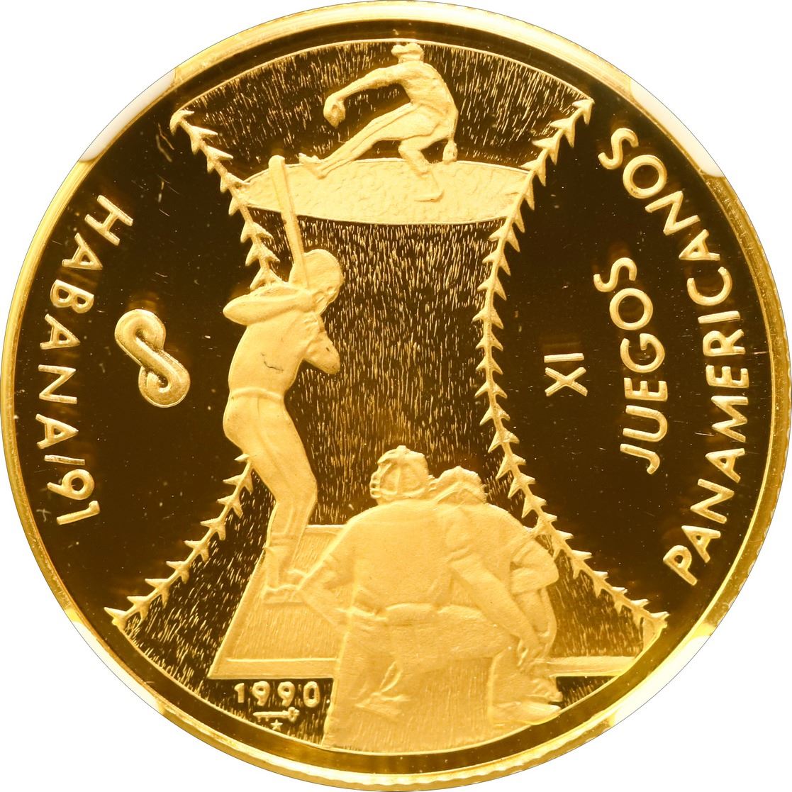 CUBA, Havana mint, gold proof 50 pesos, 1990, XI Panamerican Games Baseball, plain arms, NGC PF 69 U