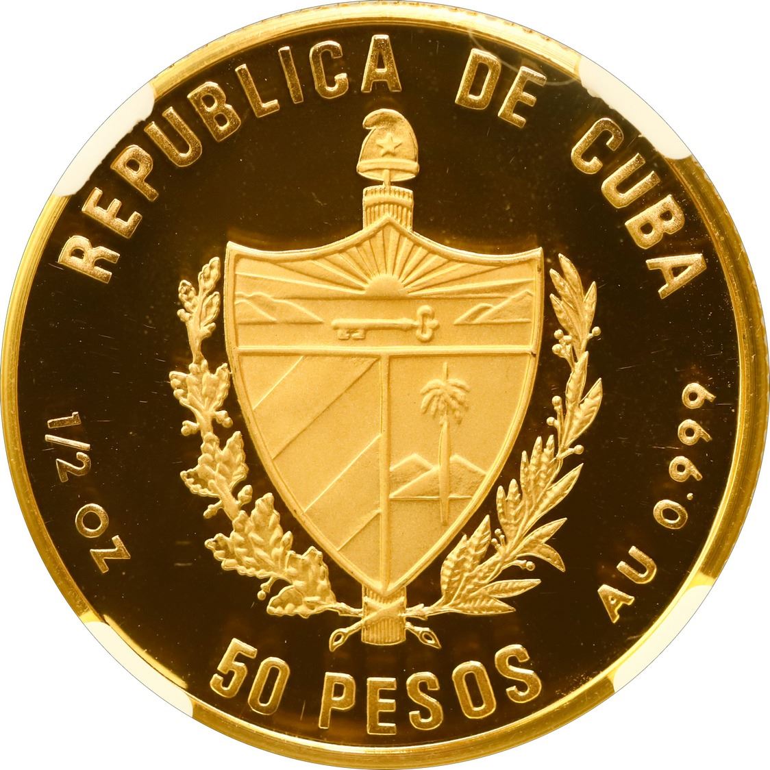 CUBA, Havana mint, gold proof 50 pesos, 1990, XI Panamerican Games Baseball, plain arms, NGC PF 69 Ultra Cameo (EMO Collection Label), "top pop." KM-321; Fr-53. Virtually perfect mirror cameo with interesting design made to look like a baseball, currently tied with three others for finest in the NGC census, from a reported mintage of just 15 pieces. Pedigreed to The Emilio M. Ortiz Collection of Cuban Gold Coins.