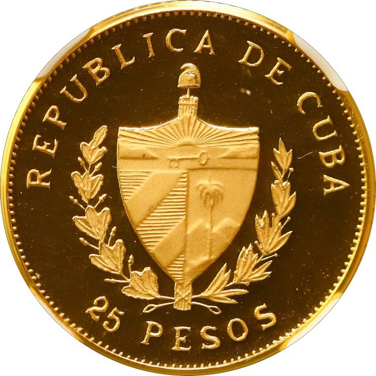 CUBA, Havana mint, gold proof piefort 25 pesos, 1988, José Martí, NGC PF 69 Ultra Cameo (EMO Collection Label), "top pop." KM-P8; Fr-22. Full mirror fields, virtually perfect, from a reported mintage of just 10 pieces, this example tied with just one other for finest in the NGC census. Pedigreed to The Emilio M. Ortiz Collection of Cuban Gold Coins.