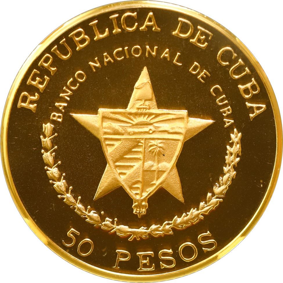 CUBA, Havana mint, gold proof piefort 50 pesos, 1989, First Train in Spain 140th Anniversary, NGC PF 69 Ultra Cameo (EMO Collection Label), "top pop." KM-P26; Fr-32. One tiny blemish away from flawlessness, currently tied with one other for finest in the NGC census, from a reported mintage of just 12 pieces. Pedigreed to The Emilio M. Ortiz Collection of Cuban Gold Coins.