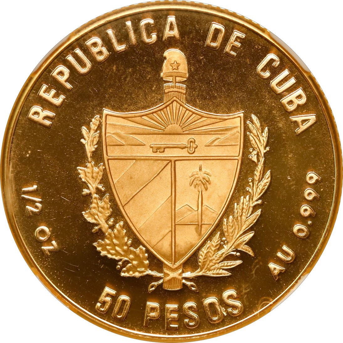 CUBA, Havana mint, gold proof piefort 50 pesos, 1990, XI Panamerican Games Volleyball, plain arms, NGC PF 69 Ultra Cameo, "top pop." KM-P50; Fr-55. Flashy mirror cameo, practically flawless and tied with just one other for finest in NGC census, from a reported mintage of only 12 coins.