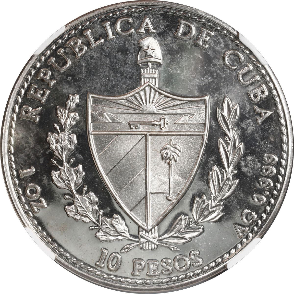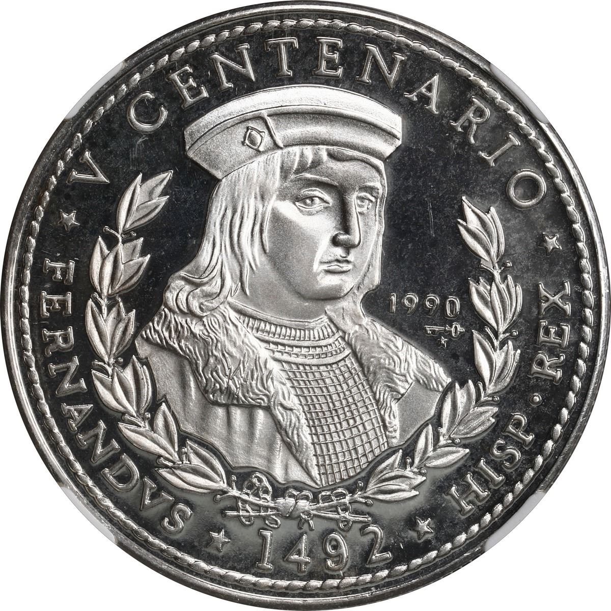 CUBA, Havana mint, proof 10 pesos, 1990, King Ferdinand / 5th Centennial of the Discovery of America, NGC PF 66 Ultra Cameo, ex-Busto. KM-263. Mintage of only 5,000 coins. Gem proof with frosty design and deep mirror fields. Pedigreed to the José Busto Collection.
