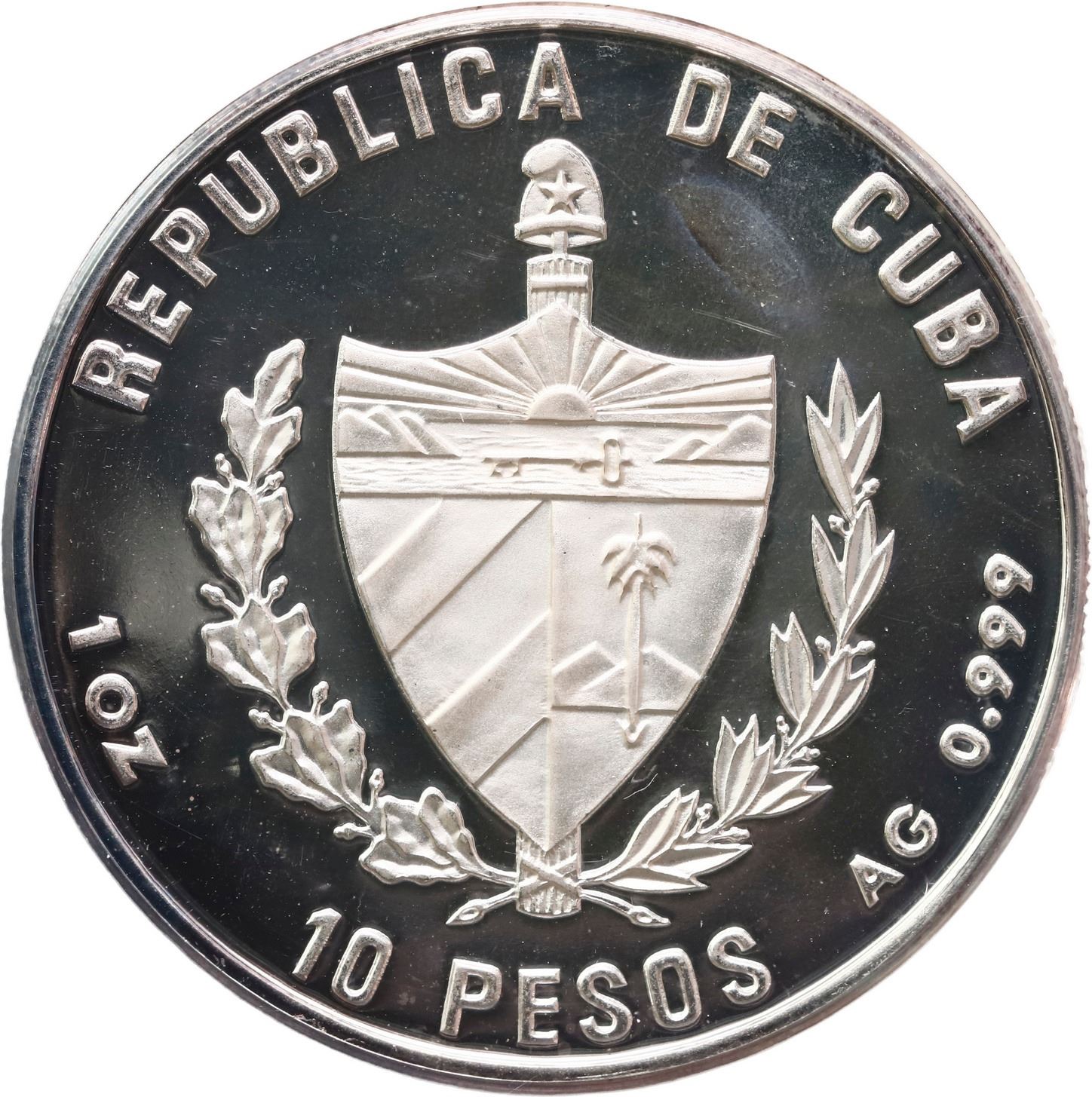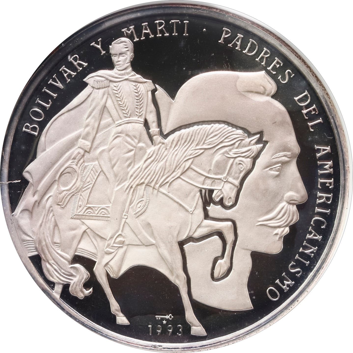 CUBA, Havana mint, proof piefort 10 pesos, 1993, Bolívar & Martí, plain arms, NGC PF 68 Ultra Cameo, "top pop." KM-P55. Flashy and bright, with only minor discoloration on frosted details, currently tied with five others for finest in the NGC census (mintage quantity unknown).