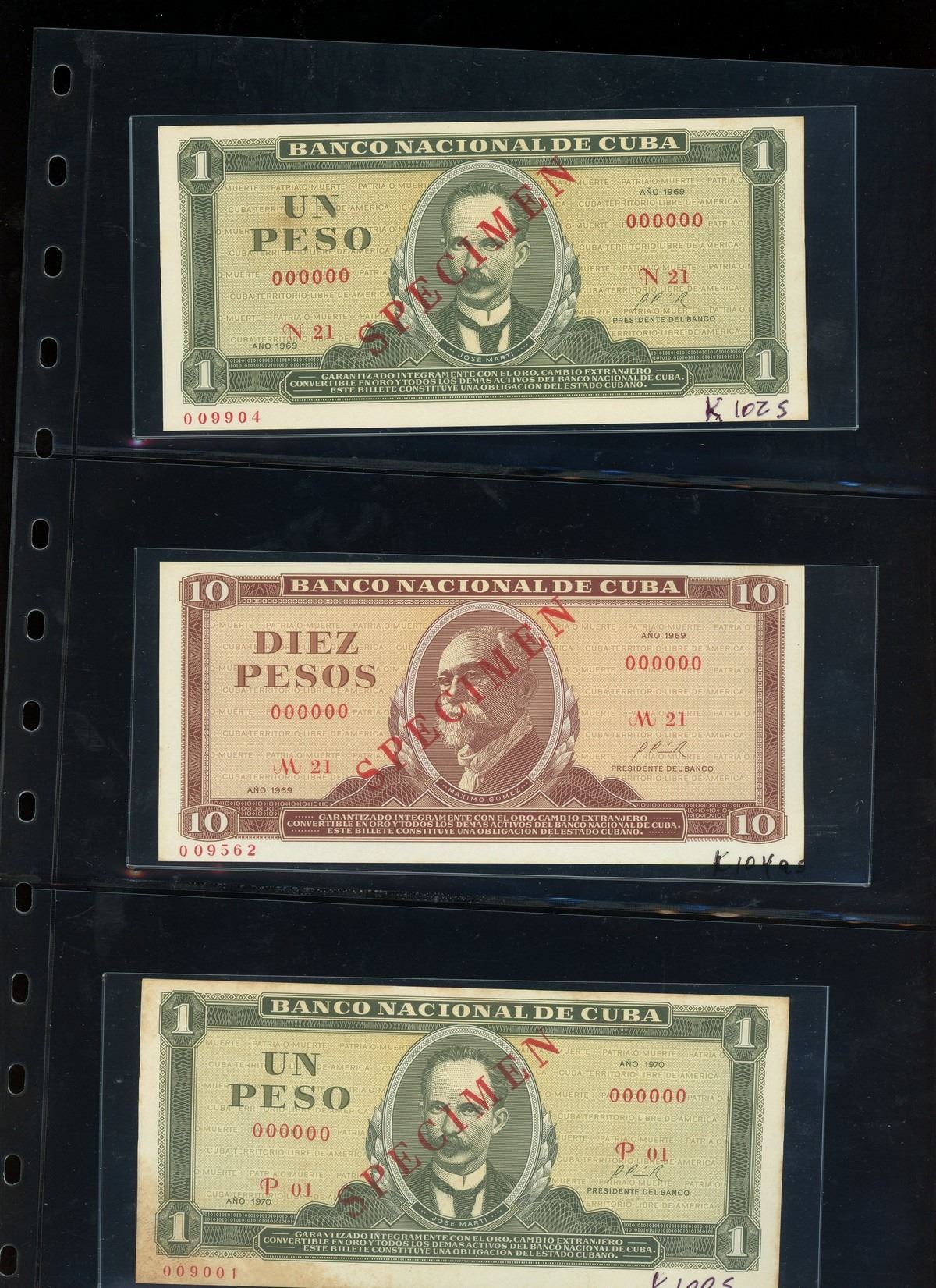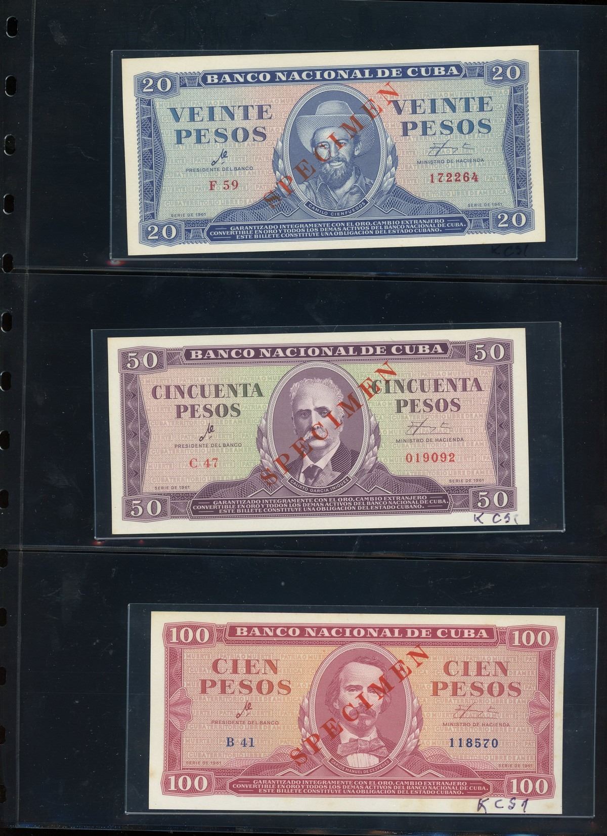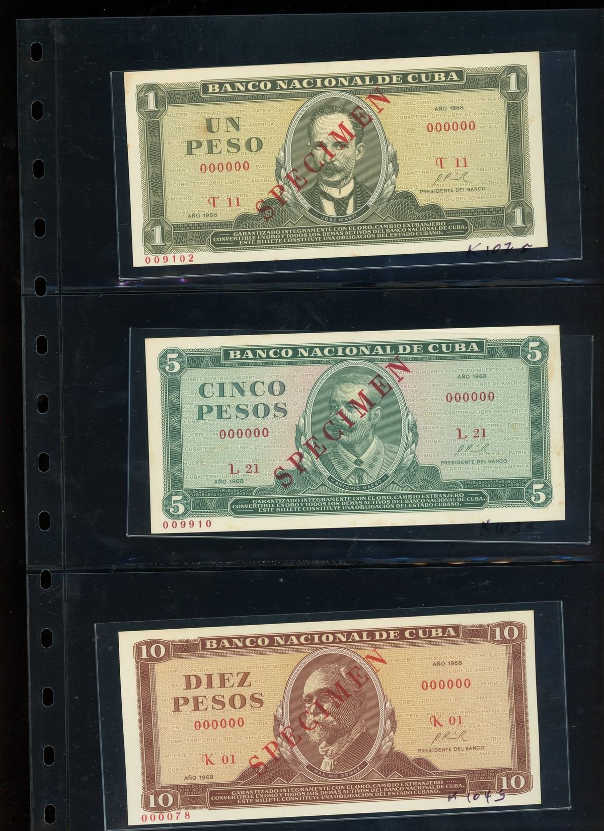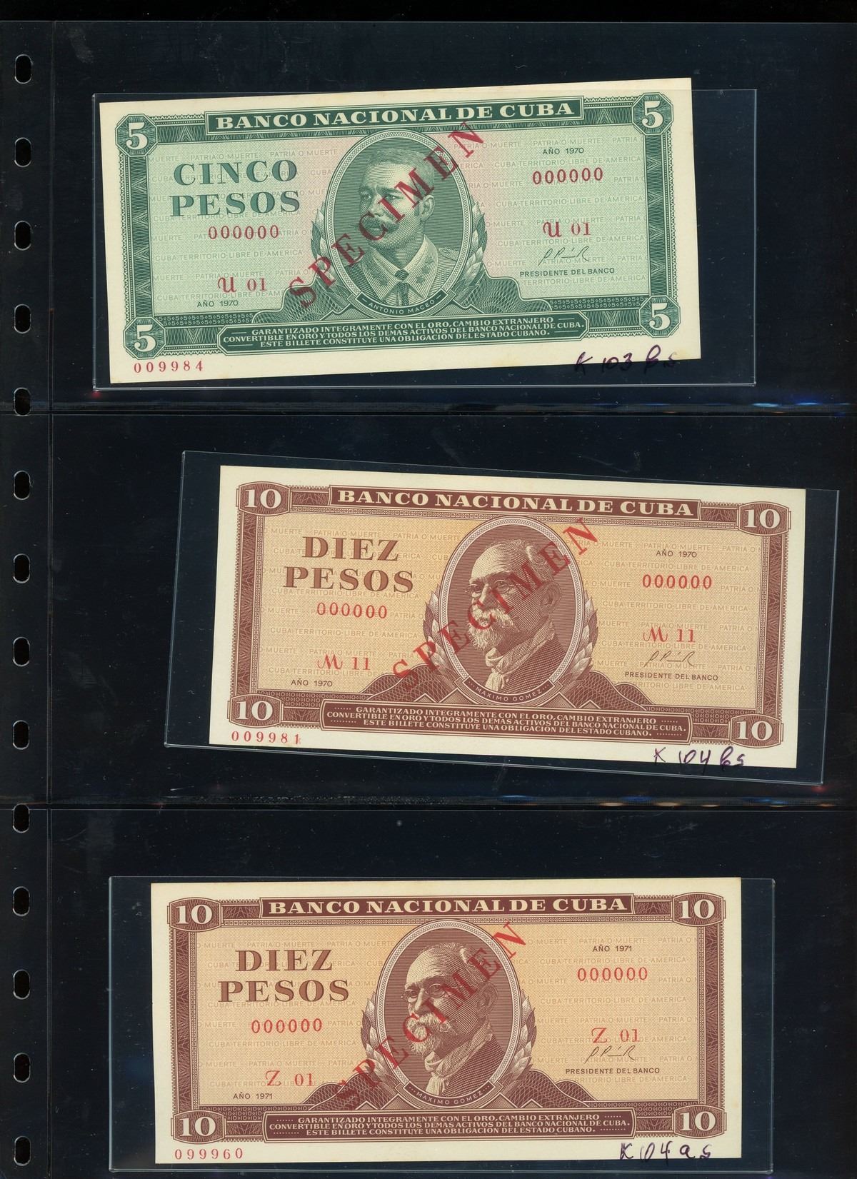 CUBA, binder of Cuban notes, ex-Busto. Total: 56 notes. A companion set to the prior lot, this assemblage is focused mostly on Cuban specimen notes from 1961 to 1983 ordered by type and documented with their Pick numbers. All grading UNC or nearly so, with some exhibiting minor paper toning. Housed in a professional binder and slipcase. Personal inspection highly recommended. Pedigreed to the José Busto Collection.