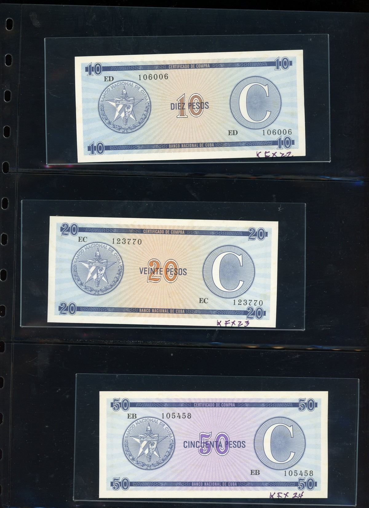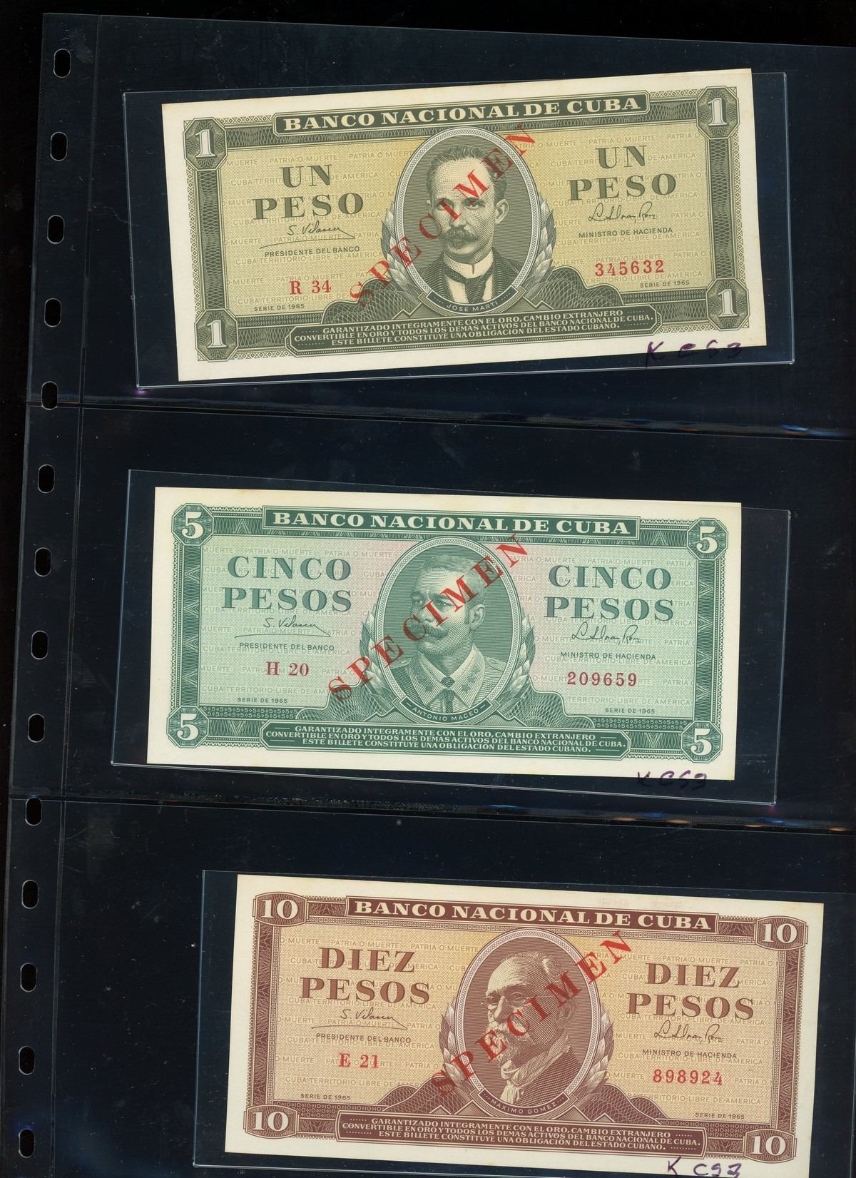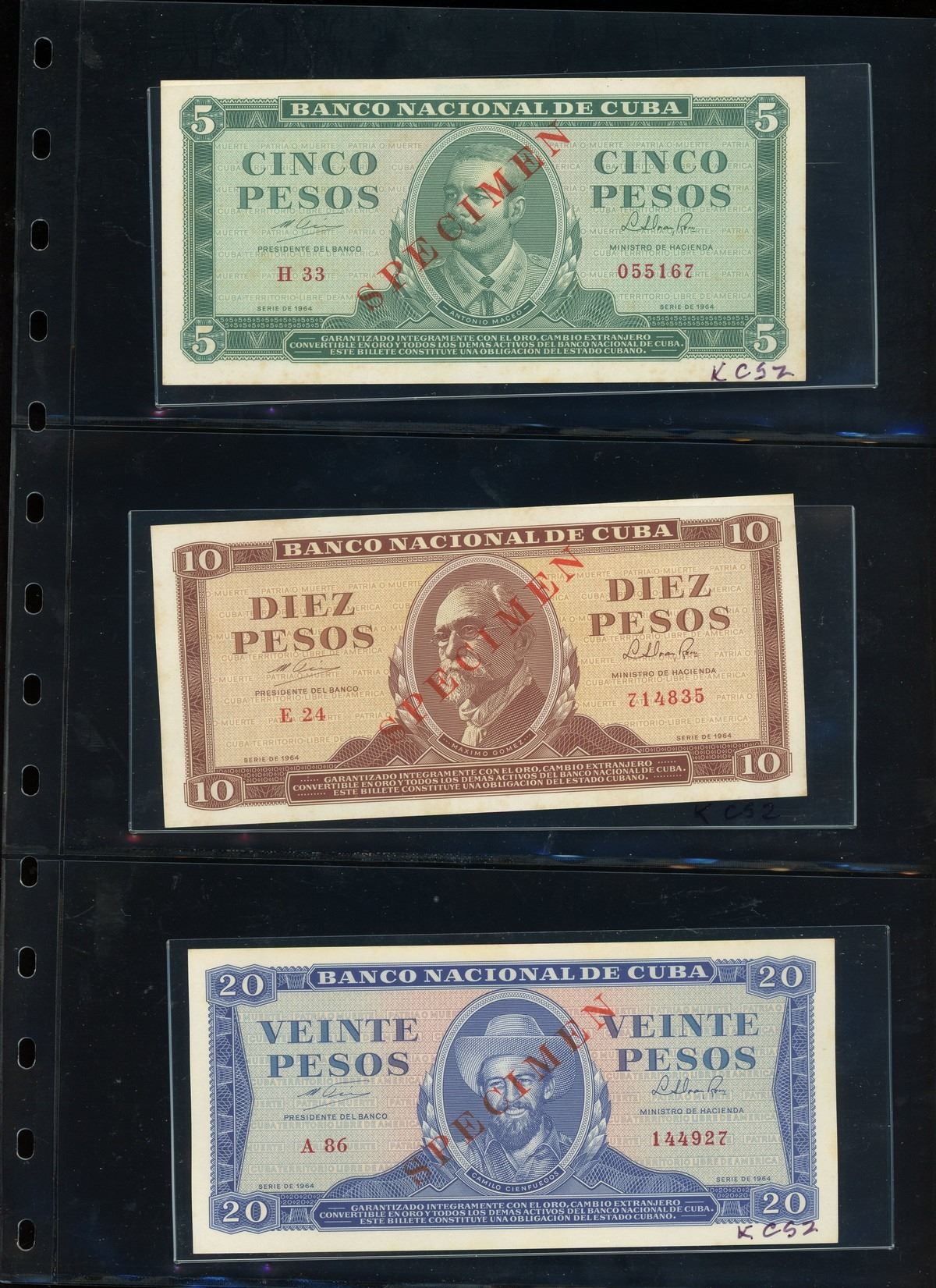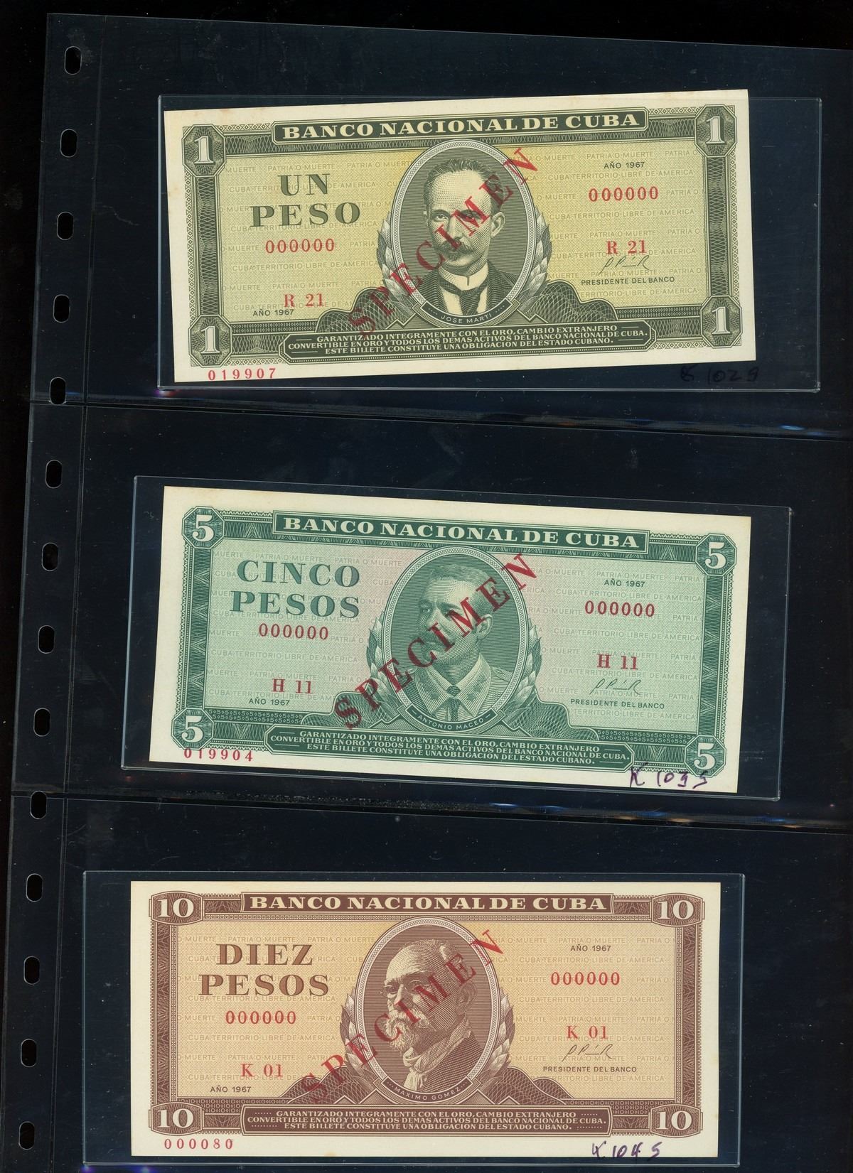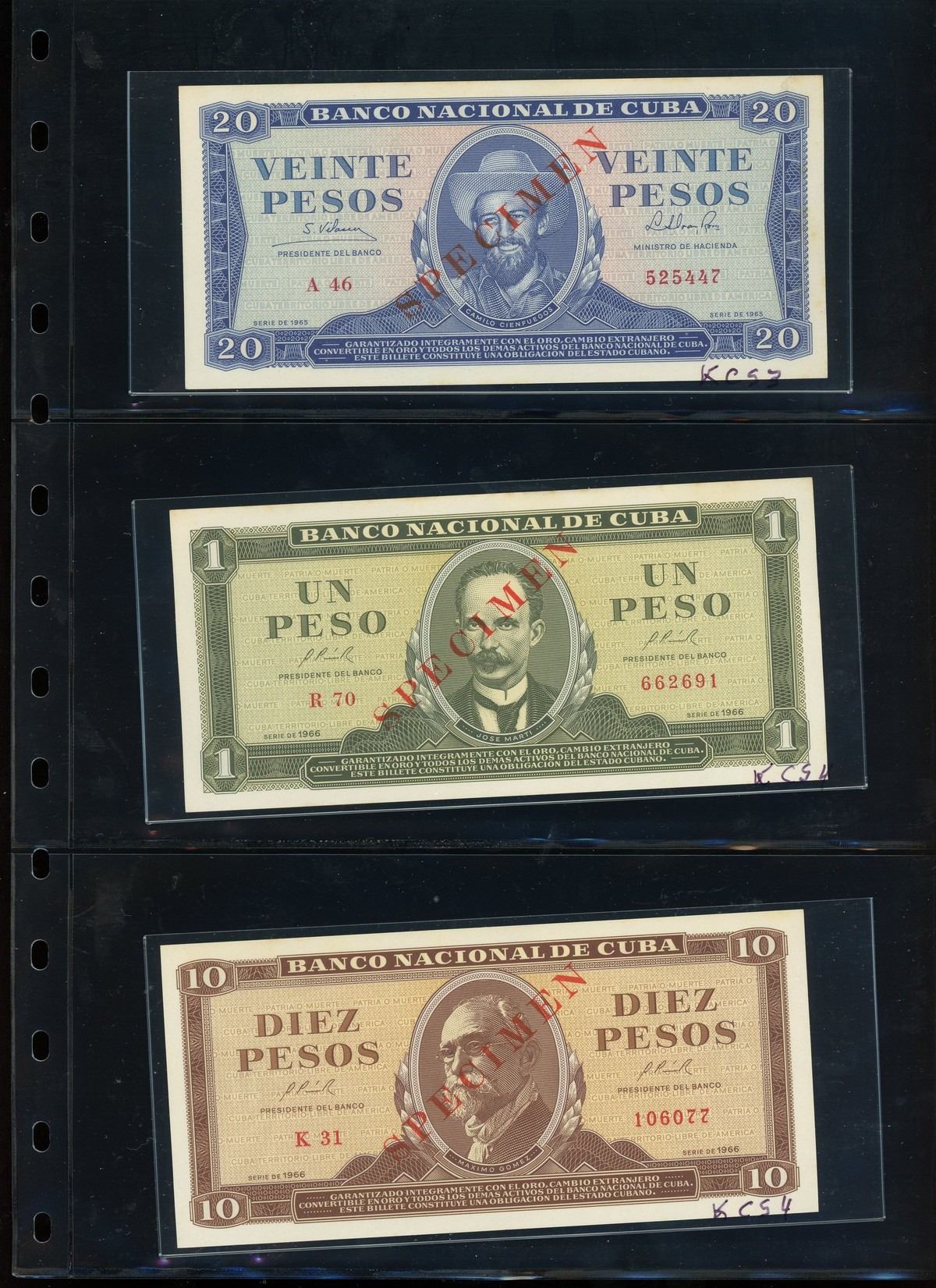 CUBA, binder of Cuban notes, ex-Busto. Total: 56 notes. A companion set to the prior lot, this assemblage is focused mostly on Cuban specimen notes from 1961 to 1983 ordered by type and documented with their Pick numbers. All grading UNC or nearly so, with some exhibiting minor paper toning. Housed in a professional binder and slipcase. Personal inspection highly recommended. Pedigreed to the José Busto Collection.