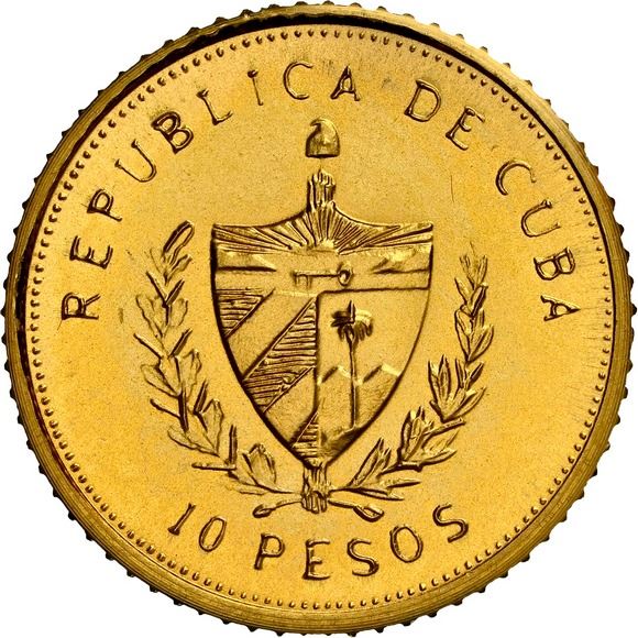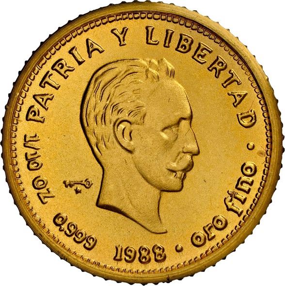 CUBA, gold 10 pesos, 1988, José Martí, NGC MS 69. KM-211; Fr-24. Bright yellow color with virtually flawless frosted finish, from a reported mintage of just 50 pieces.