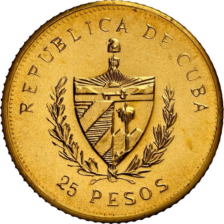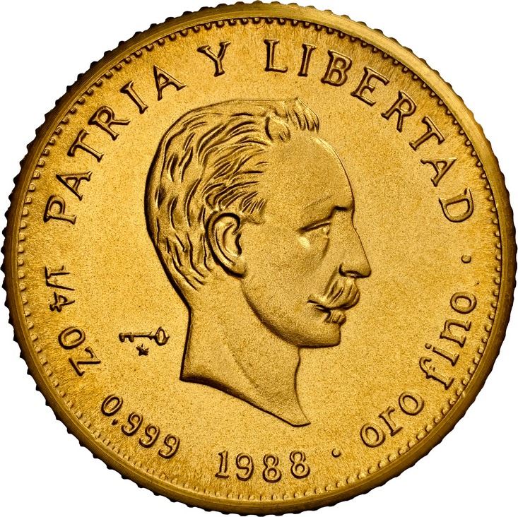 CUBA, gold 25 pesos, 1988, José Martí, NGC MS 68. KM-213; Fr-22. Frosted finish in light yellow color, virtually flawless, from a reported mintage of 50 pieces.