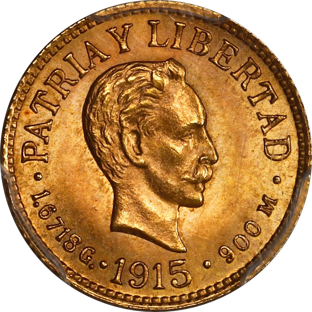 CUBA, struck at the Philadelphia mint, gold 1 peso, 1915, José Martí, PCGS MS65.