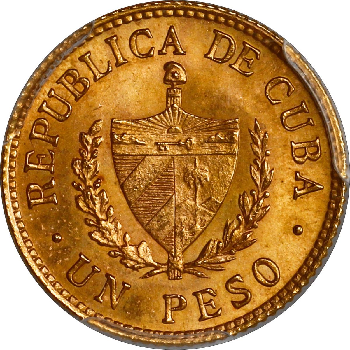CUBA, struck at the Philadelphia mint, gold 1 peso, 1915, José Martí, PCGS MS65. KM-16; Fr-7. Rich gold color, cartwheel luster with central halo, gem grade (AGW 0.0484 oz).