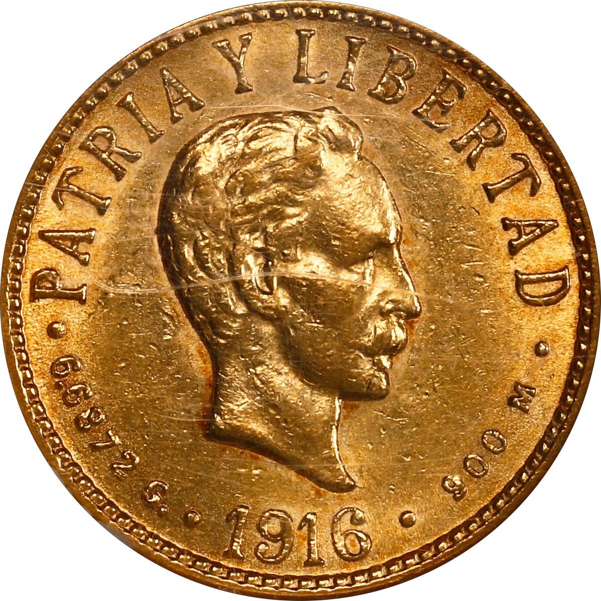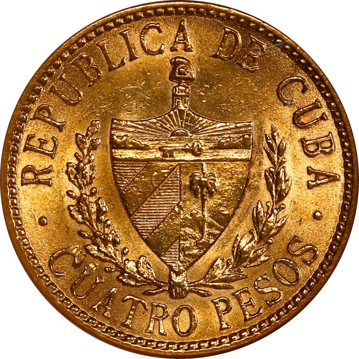 CUBA, struck at the Philadelphia mint, gold 4 pesos, 1916, José Martí, NGC AU 55.