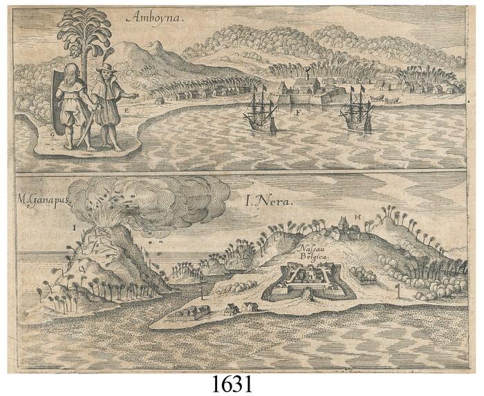 Ca.-1655 German wood-cut engraving showing East India Co. settlements in Indonesia. 8" x 6¼". Fine engraving showing two scenes: one with 2 Europeans in the foreground of a coastal settlement with 2 galleons in harbor and legend "Amboyna" at top in reference to Amboyna, Maluku Islands, Indonesia, where competing Dutch and British East India Cos. famously came to loggerheads; the other showing an erupting volcano on one of 2 islands, the other with a fort titled "Nassau Belgica" and with "I. Nera" at top and "M. Ganapus" to the left of the volcano, a reference to Mount Ganapus and Nera Island, Banda Islands, Indonesia. With Old German type on back, printed by J. Gottfreidt of Frankfurt, Germany, in the 1600s, excellent condition, rare.