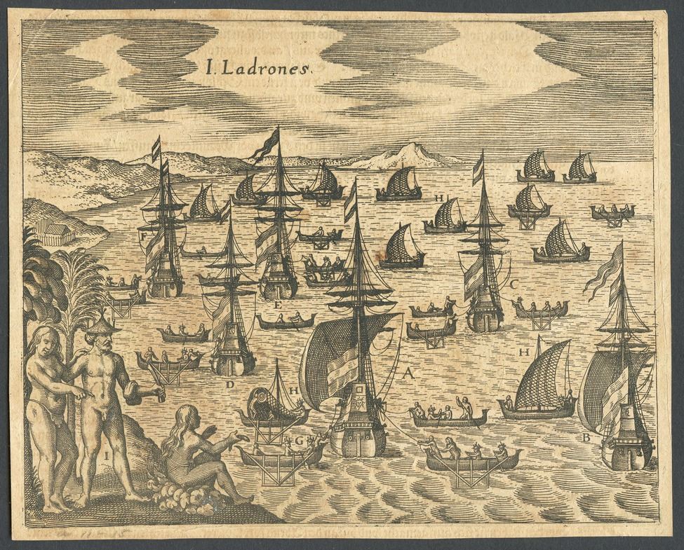 Ca.-1655 German wood-cut engraving showing an island off Panama. 7-3/4" x 6-1/4" Fine engraving showing natives overlooking a harbor containing 6 galleons and a host of smaller boats with the caption at top "I. Ladrones" ("Thieves' Island"), an island off Panama, with Old German type on back, printed by J. Gottfreidt of Frankfurt, Germany, in the 1600s, excellent condition, rare.