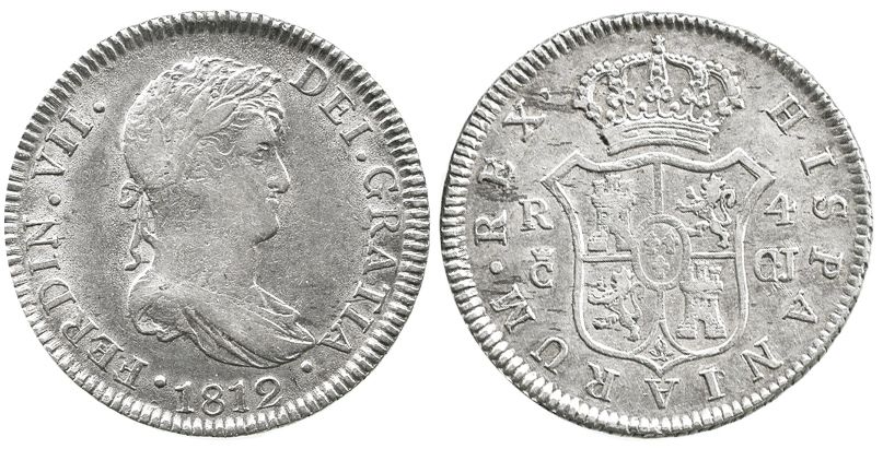 Cadiz, Spain, bust 4 reales, Ferdinand VII, 1812CJ, narrow bust.