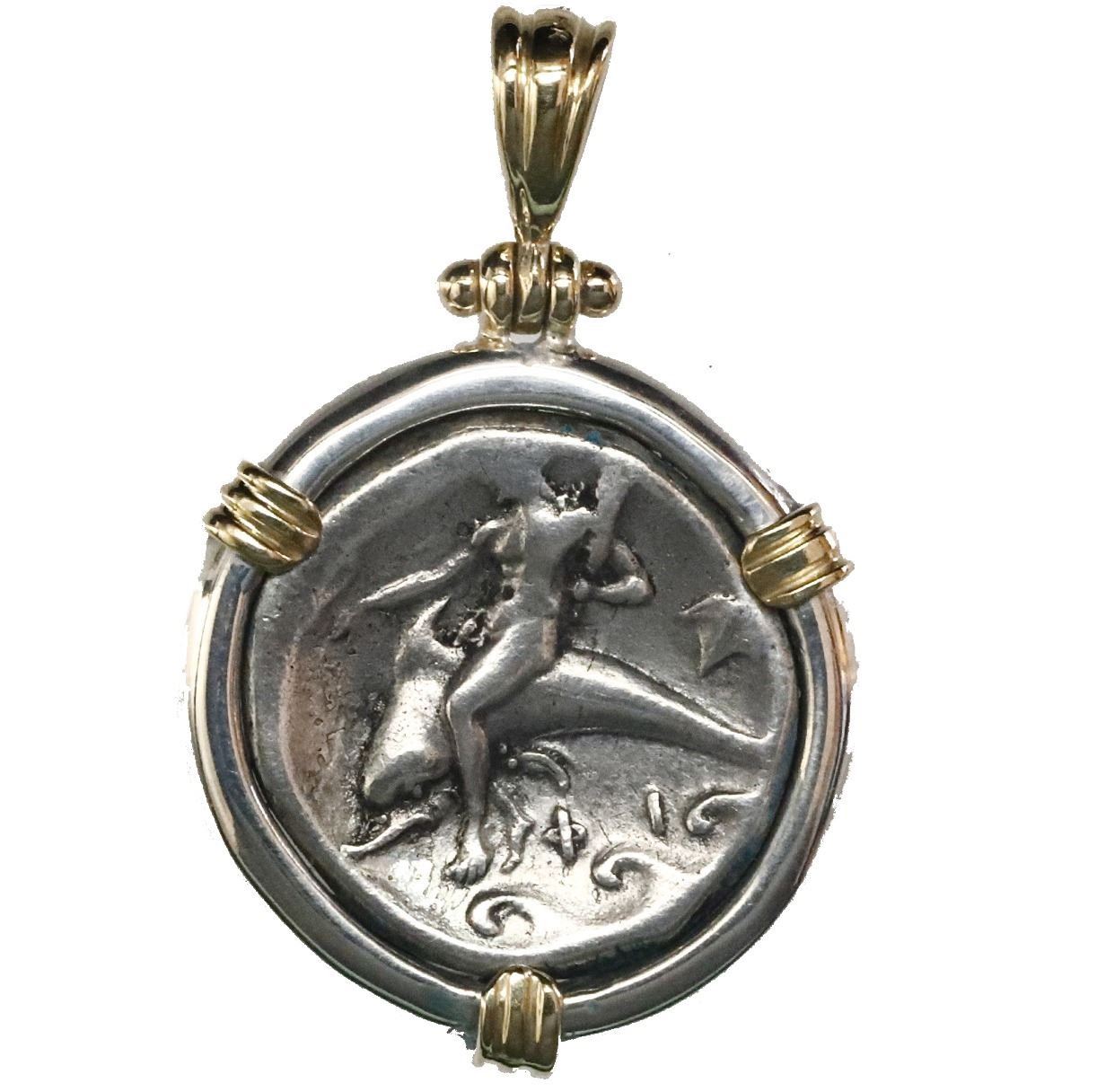 Calabria, Tarentum, AR didrachm or nomos, ca. 334-330 BC, "boy on dolphin," aligned axis, mounted in thick silver bezel with 14K gold prongs and shackle bail. 13.35 grams total. Helmeted, nude warrior on horse prancing right / Taras astride dolphin left, distaff over his left shoulder, ivy leaf behind and waves below. Well-toned XF coin in attractive silver and gold setting. With photo-certificate.