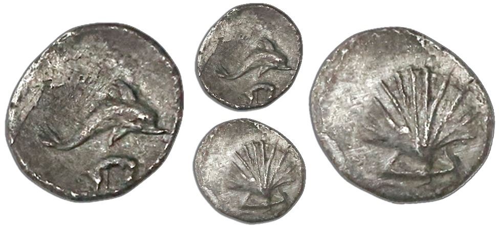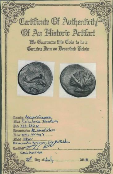 Calabria, Tarentum, AR hemilitron, ca. 325-280 BC, shell / dolphin. HN Italy-980. .37 grams. Cockle shell / Dolphin right; uncertain symbol or monogram below, VF. With photo-certificate.