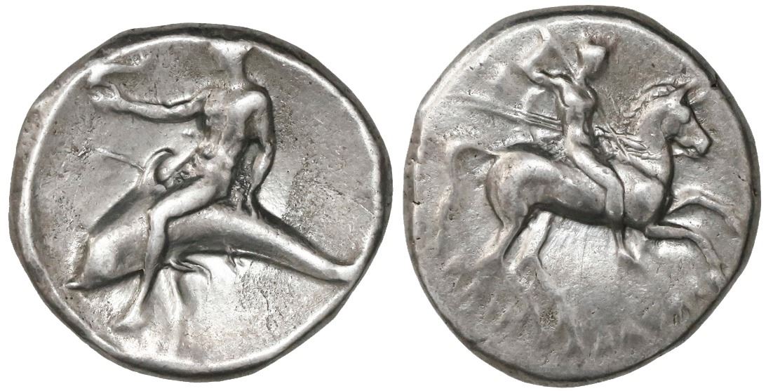 Calabria, Tarentum, AR nomos "boy on dolphin," ca. 272-240 BC.