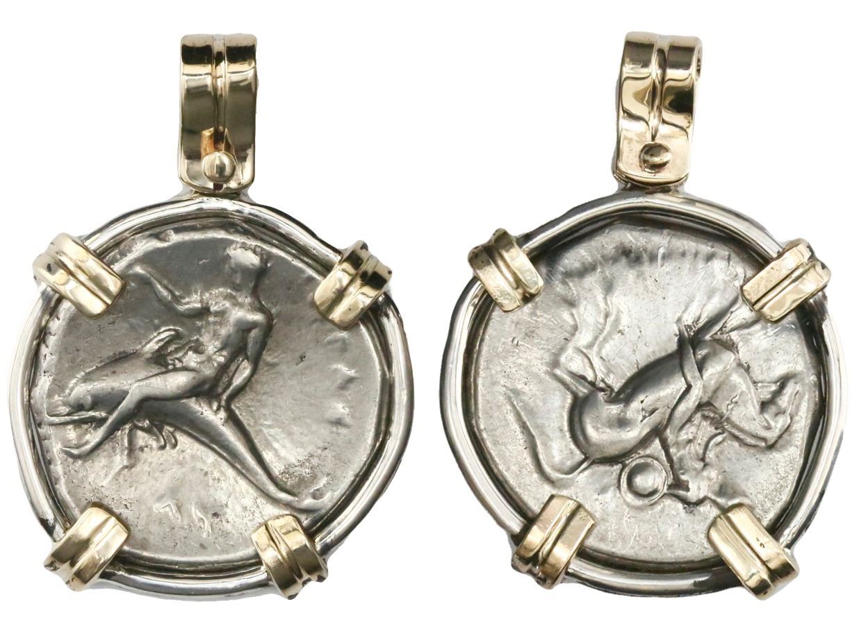 Calabria, Tarentum, AR nomos, ca. 280 BC, "boy on dolphin," mounted dolphin-side out in silver bezel with 14K gold prongs and swivel bail. 12.69 grams total. Helmeted, nude warrior on horse galloping left, holding round shield on left arm, reins in right hand / Nude Taras astride dolphin left, holding cantharus in extended right hand. AXF with hints of luster, full details. With photo-certificate.